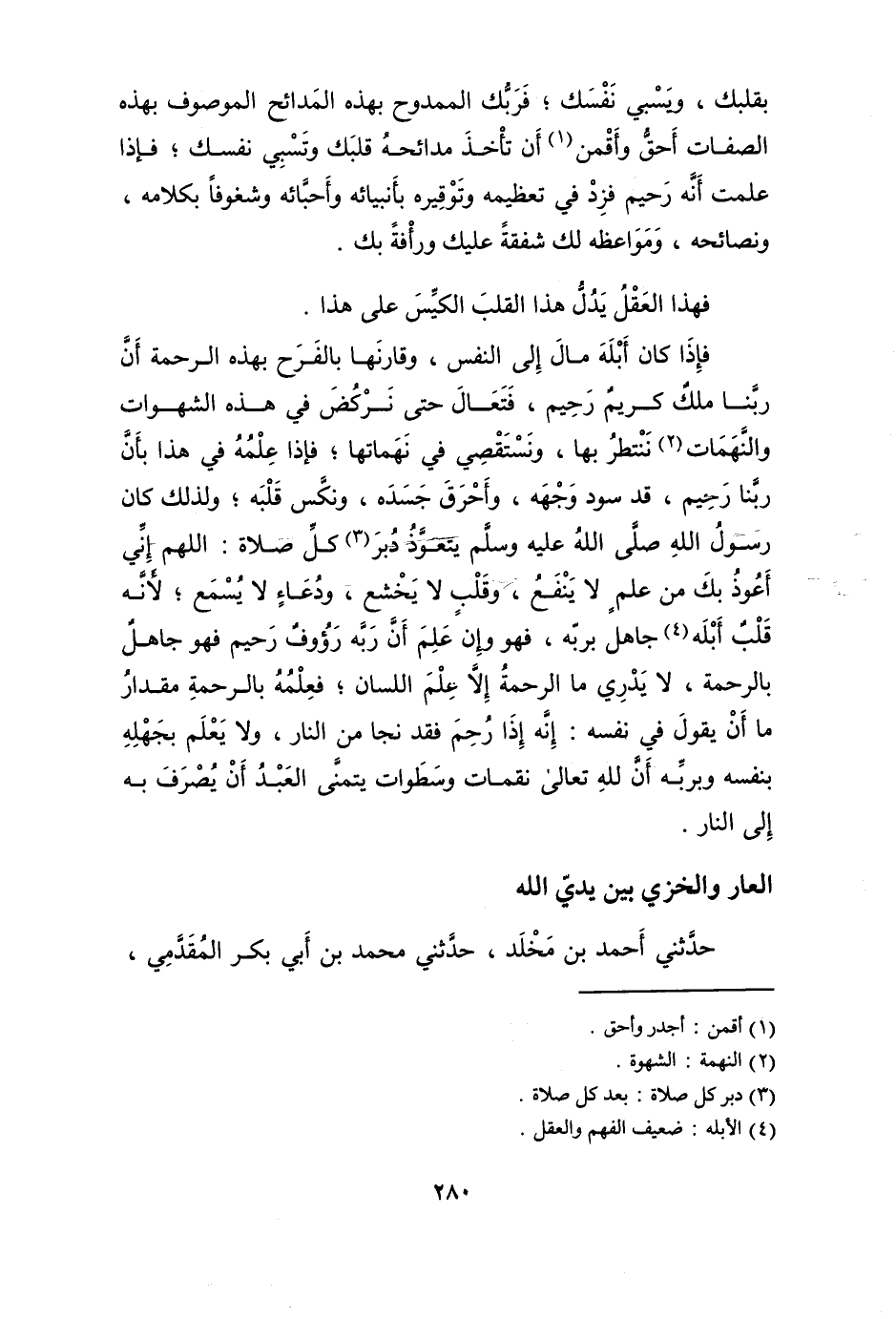 فَإِذا كَانَ أبله مَال إِلَى النَّفس وقارنها بالفرح بِهَذِهِ الرَّحْمَة أَن رَبنَا ملك كريم رَحِيم فتعال حَتَّى نركض فِي هَذِه الشَّهَوَات والنهمات نَنْتَظِر بهَا ونستقصي فِي نهماتها فَإِذا علمه فِي هَذَا بِأَن رَبنَا رَحِيم قد سود وَجهه وأحرق جسده ونكس قلبه وَلذَلِك كَانَ رَسُول الله صلى الله عَلَيْهِ وَسلم يتَعَوَّذ دبر كل صَلَاة (اللَّهُمَّ إِنِّي أعوذ بك من علم لَا ينفع وقلب لَا يخشع وَدُعَاء لَا يسمع) لِأَنَّهُ قلب أبله جَاهِل بربه فَهُوَ وَإِن علم أَن ربه رؤوف رَحِيم فَهُوَ جَاهِل بِالرَّحْمَةِ لَا يدْرِي مَا الرَّحْمَة إِلَّا علم اللِّسَان فَعلمه بِالرَّحْمَةِ مِقْدَار مَا أَن يَقُول فِي نَفسه إِنَّه إِذا رحم فقد نجا من النَّار وَلَا يعلم بجهله بِنَفسِهِ وبربه أَن لله تَعَالَى نقمات وسطوات يتَمَنَّى العَبْد أَن يصرف بِهِ إِلَى النَّار