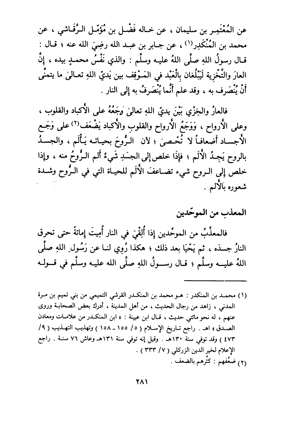 فالمعذب من الْمُوَحِّدين إِذا ألقِي فِي النَّار أميت إماتة حَتَّى تحرق النَّار جسده ثمَّ يحيا بعد ذَلِك هَكَذَا رُوِيَ لنا عَن رَسُول الله صلى الله عَلَيْهِ وَسلم قَالَ رَسُول الله صلى الله عَلَيْهِ وَسلم فِي قَوْله