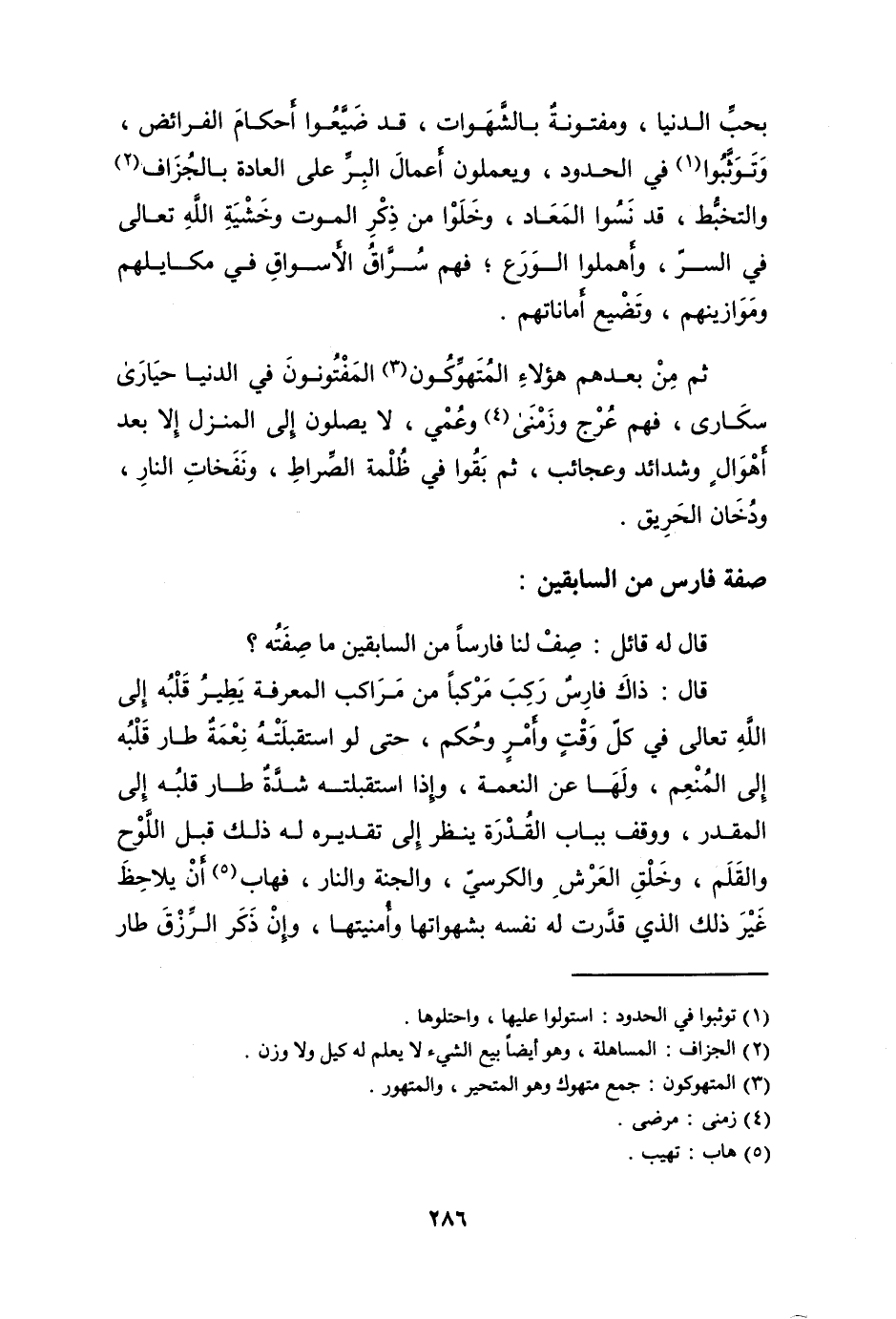 قَالَ ذَاك فَارس ركب مركبا من مراكب الْمعرفَة يطير قلبه إِلَى الله تَعَالَى فِي كل وَقت وَأمر وَحكم حَتَّى لَو استقبلته نعْمَة طَار قلبه إِلَى الْمُنعم وَلها عَن النِّعْمَة وَإِذا استقبلته شدَّة طَار قلبه إِلَى الْمُقدر ووقف بِبَاب الْقُدْرَة ينظر إِلَى تَقْدِيره لَهُ ذَلِك قبل اللَّوْح والقلم وَخلق الْعَرْش والكرسي وَالْجنَّة وَالنَّار فهاب أَن يُلَاحظ غير ذَلِك الَّذِي قدرت لَهُ نَفسه بشهواتها وأمنيتها وَإِن ذكر الرزق طَار