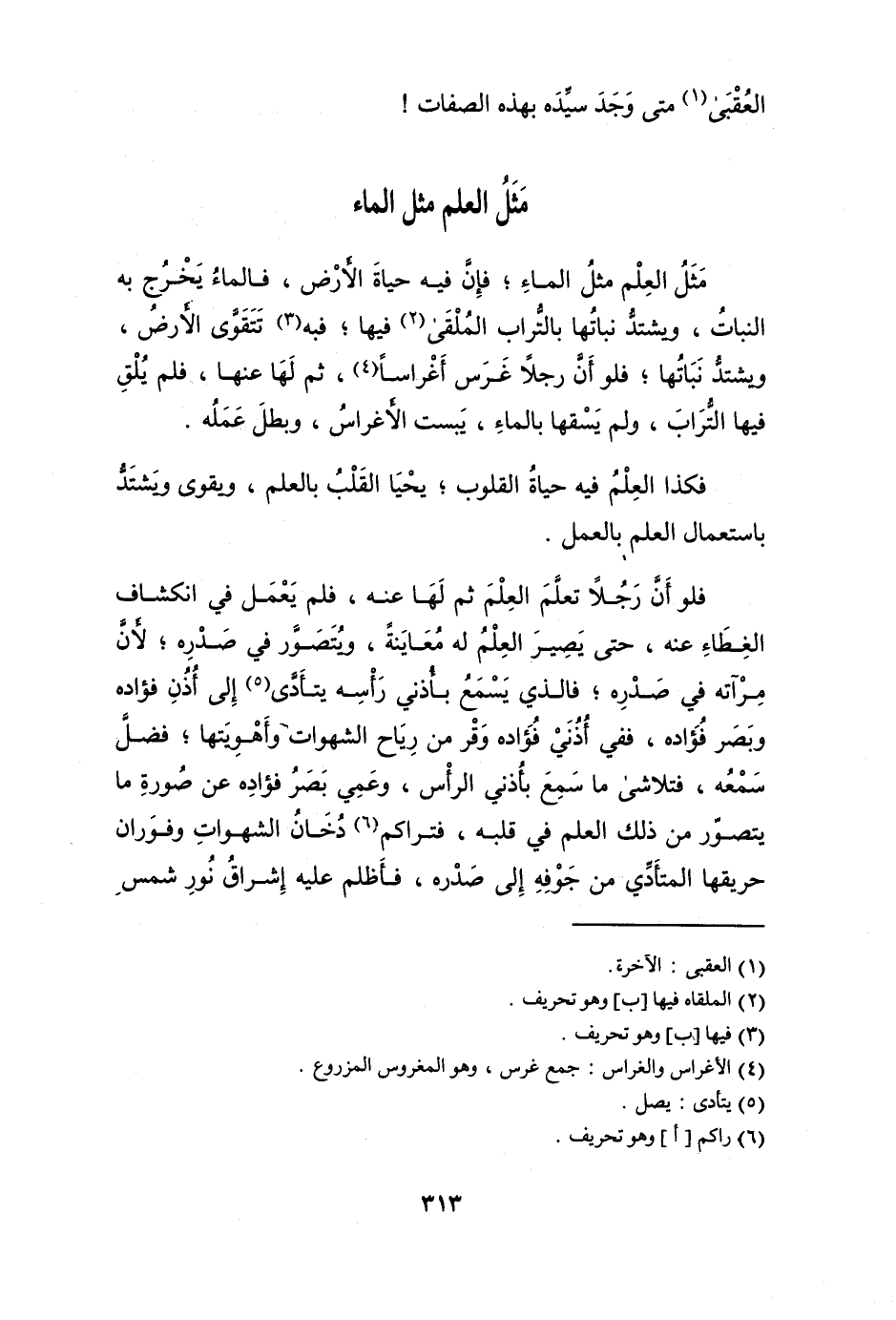 مثل الْعلم مثل المَاء فَإِن فِيهِ حَيَاة الأَرْض فالماء يخرج بِهِ النَّبَات ويشتد نباتها بِالتُّرَابِ الْملقى فِيهَا فبه تتقوى الأَرْض ويشتد نباتها فَلَو أَن رجلا غرس أغراسا ثمَّ لَهَا عَنْهَا فَلم يلق فِيهَا التُّرَاب وَلم يسقها بِالْمَاءِ يَبِسَتْ الأغراس وَبَطل عمله