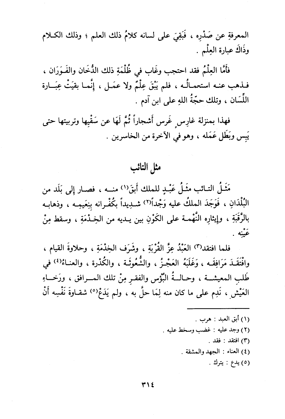 مثل التائب مثل عبد للْملك أبق مِنْهُ فَصَارَ إِلَى بلد من الْبلدَانِ فَوجدَ الْملك عَلَيْهِ وجدا شَدِيدا بكفرانه بنعيمه وذهابه بِالرَّقَبَةِ وإيثاره النهمة على الْكَوْن بَين يَدَيْهِ من الْخدمَة وَسقط من عينه