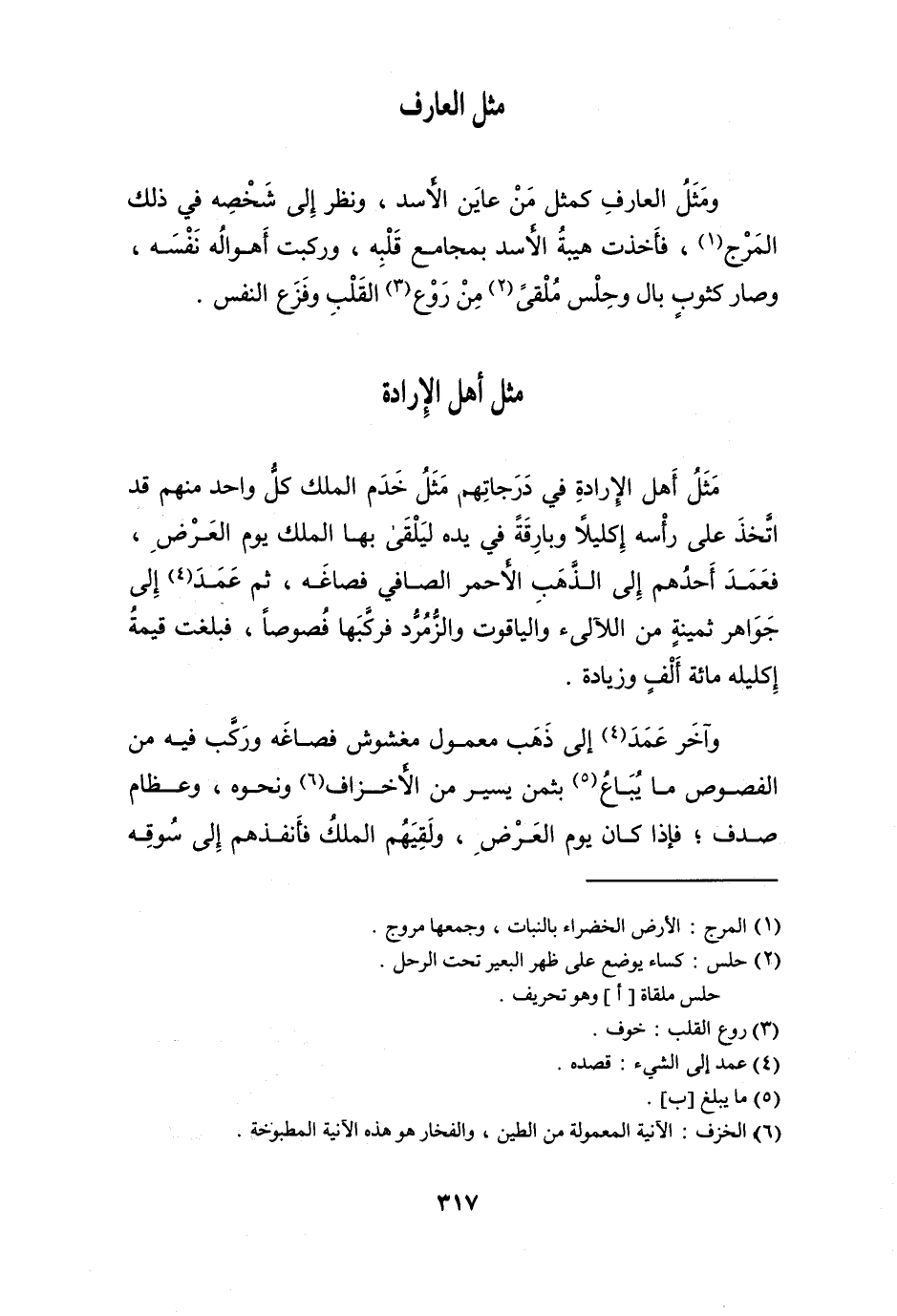 مثل أهل الْإِرَادَة فِي درجاتهم مثل خدم الْملك كل وَاحِد مِنْهُم قد اتخذ على رَأسه إكليلا وبارقة فِي يَده ليلقى بهَا الْملك يَوْم الْعرض فَعمد أحدهم إِلَى الذَّهَب الْأَحْمَر الصافي فصاغه ثمَّ عمد إِلَى جَوَاهِر ثمينة من اللآلئ والياقوت والزمرد فركبها فصوصا فبلغت قيمَة إكليله مائَة ألف وَزِيَادَة