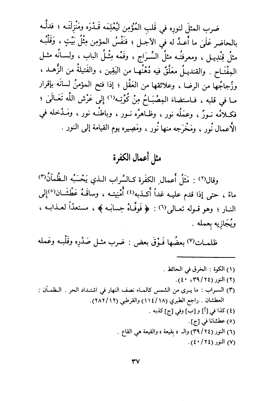 ضرب الْمثل لنوره فِي قلب الْمُؤمن ليعلمه قدره ومنزلته فدله بالحاضر على مَا أعد لَهُ فِي الآجل فَنَفْس الْمُؤمن مثل بَيت وَقَلبه مثل قنديل ومعرفته مثل السراج وفمه مثل الْبَاب وَلسَانه مثل الْمِفْتَاح والقنديل مُعَلّق فِيهِ دهنها من الْيَقِين والفتيلة من الزّهْد وزجاجها من الرِّضَا وعلائقها من الْعقل إِذا فتح الْمُؤمن لِسَانه بِإِقْرَار مَا فِي قلبه فاستضاء الْمِصْبَاح من كوته إِلَى عرش الله تَعَالَى فَكَلَامه نور وَعَمله نور وَظَاهره نور وباطنه نور ومدخله فِي الْأَعْمَال نور ومخرجه مِنْهَا نور ومصيره يَوْم الْقِيَامَة إِلَى النُّور