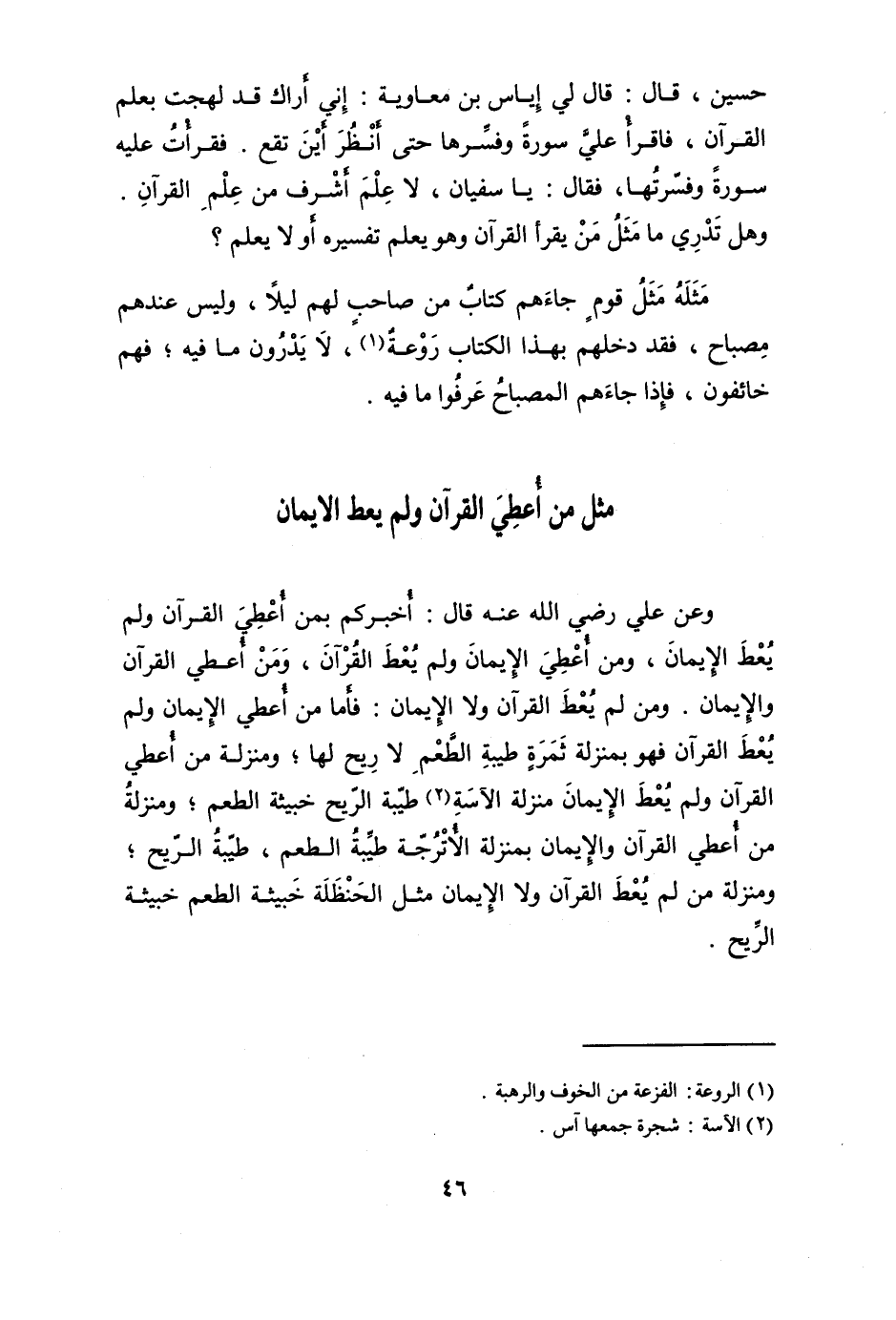 وَعَن عَليّ رَضِي الله عَنهُ قَالَ أخْبركُم بِمن أعطي الْقُرْآن وَلم يُعْط الْإِيمَان وَمن أعطي الْإِيمَان وَلم يُعْط الْقُرْآن وَمن أعطي الْقُرْآن وَالْإِيمَان وَمن لم يُعْط الْقُرْآن وَلَا الْإِيمَان فَأَما من أعطي الْإِيمَان وَلم يُعْط الْقُرْآن فَهُوَ بِمَنْزِلَة ثَمَرَة طيبَة الطّعْم لَا ريح لَهَا ومنزلة من أعطي الْقُرْآن وَلم يُعْط الْإِيمَان منزلَة الآسة طيبَة الرّيح خبيثة الطّعْم ومنزلة من أعطي الْقُرْآن وَالْإِيمَان بِمَنْزِلَة الأترجة طيبَة الطّعْم طيبَة الرّيح ومنزلة من لم يُعْط الْقُرْآن وَلَا الْإِيمَان مثل الحنظلة خبيثة الطّعْم خبيثة الرّيح