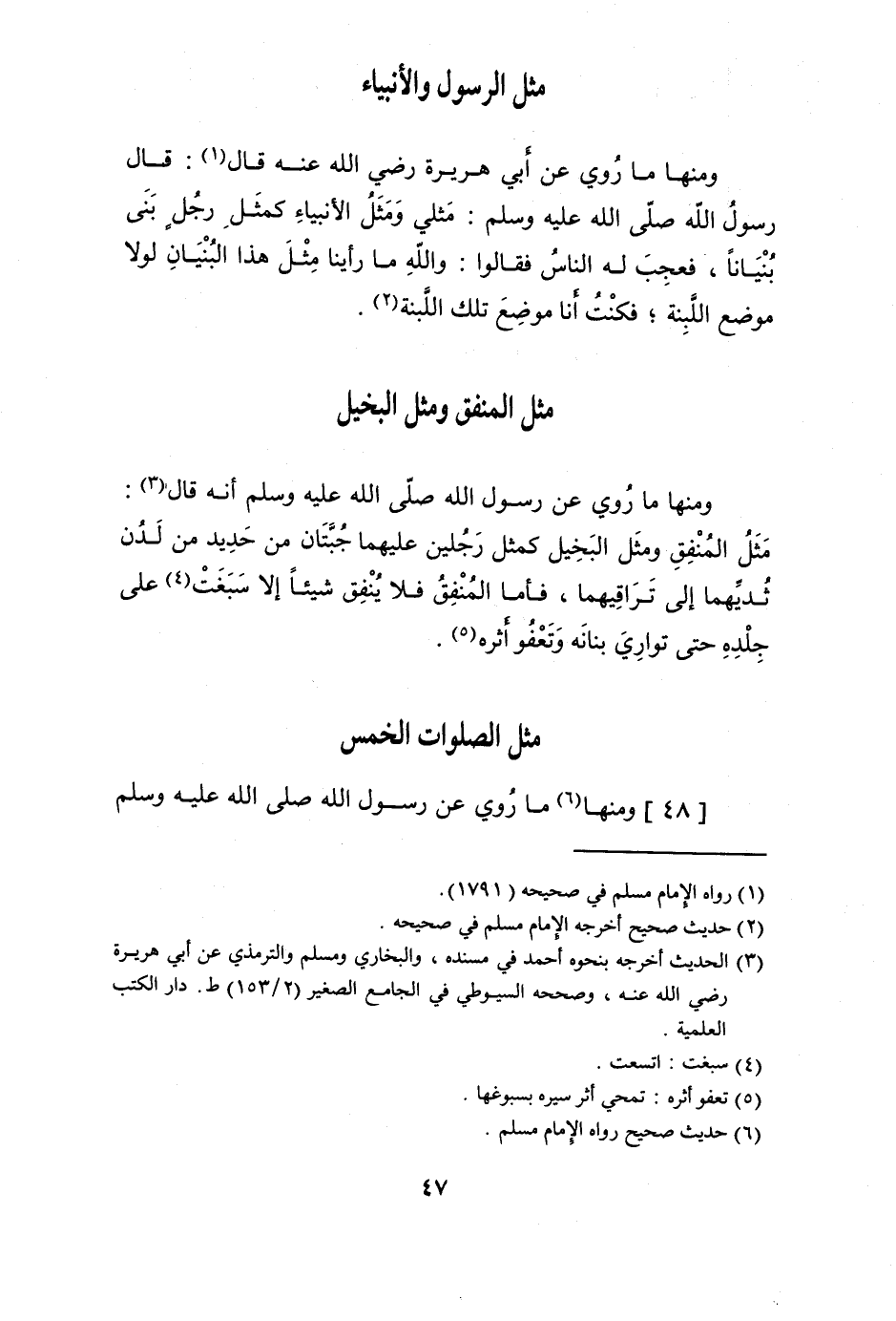 وَمِنْهَا مَا رُوِيَ عَن رَسُول الله صلى الله عَلَيْهِ وَسلم أَنه قَالَ (مثل الْمُنفق وَمثل الْبَخِيل كَمثل رجلَيْنِ عَلَيْهِمَا جبتان من حَدِيد من لدن ثديهما إِلَى تراقيهما فَأَما الْمُنفق فَلَا ينْفق شَيْئا إِلَّا سبغت على جلده حَتَّى تواري بنانه وَتَعْفُو أَثَره)