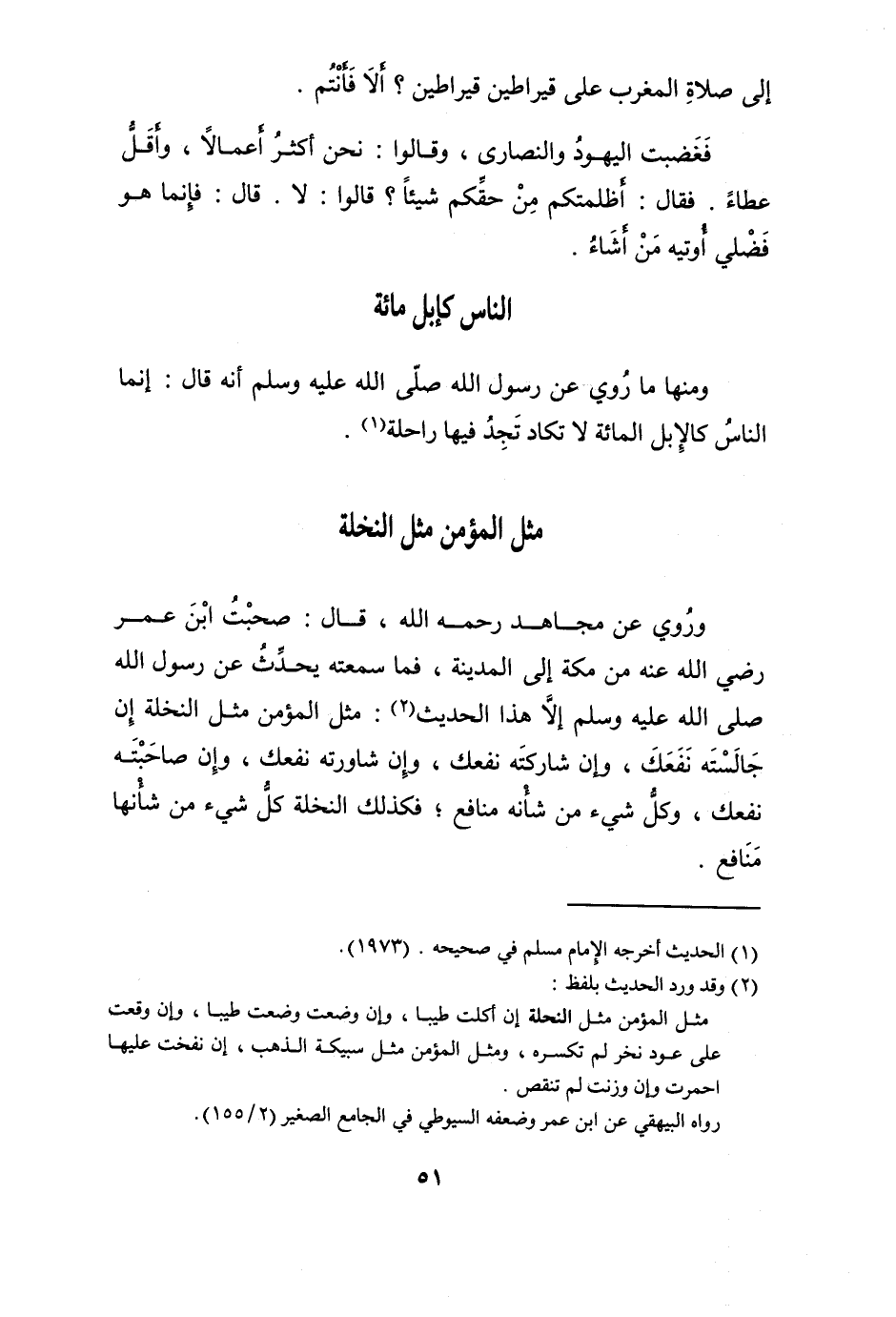 وَمِنْهَا مَا رُوِيَ عَن رَسُول الله صلى الله عَلَيْهِ وَسلم أَنه قَالَ (إِنَّمَا النَّاس كَالْإِبِلِ الْمِائَة لَا تكَاد تَجِد فِيهَا رَاحِلَة)