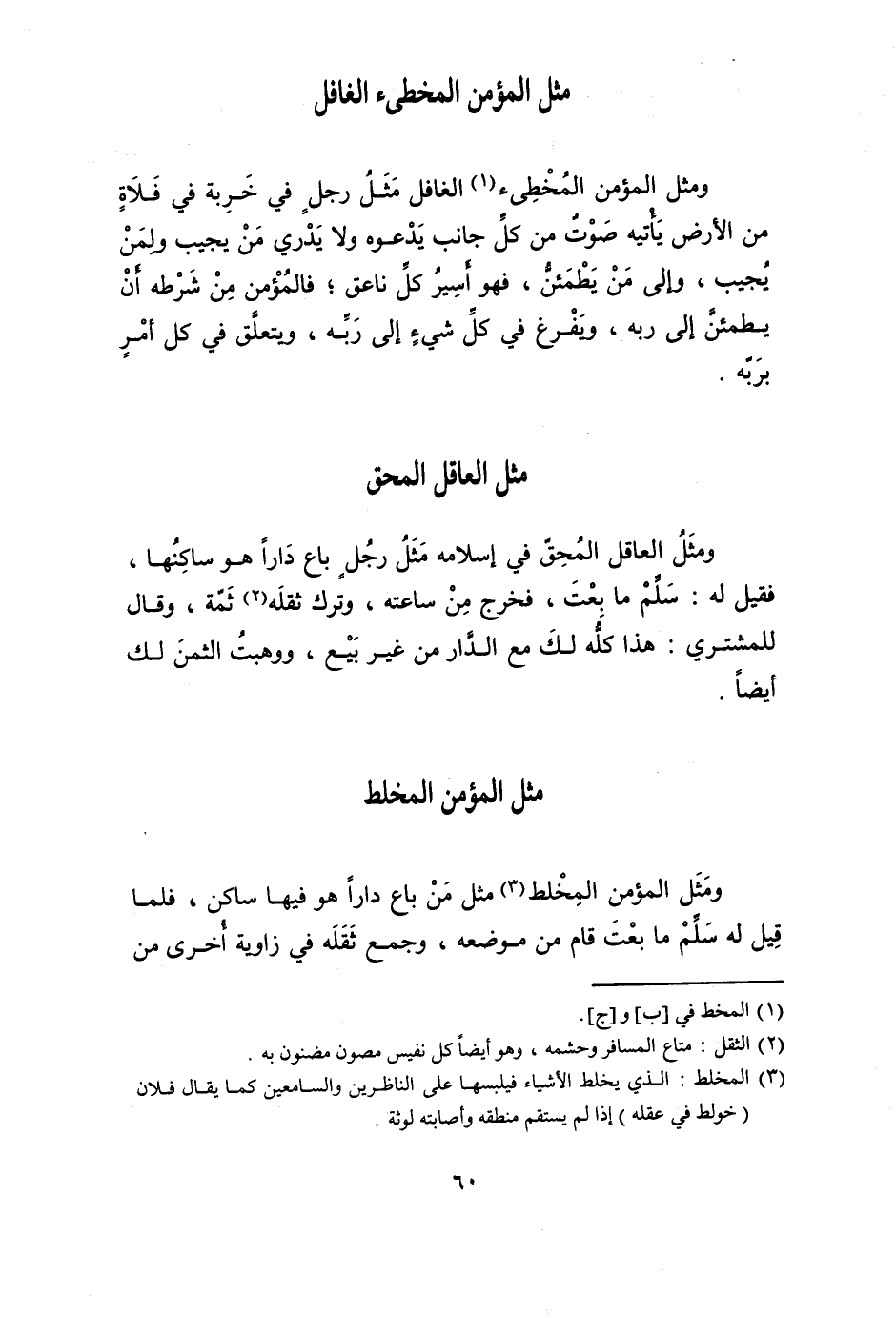 وَمثل الْعَاقِل المحق فِي إِسْلَامه مثل رجل بَاعَ دَارا هُوَ ساكنها فَقيل لَهُ سلم مَا بِعْت فَخرج من سَاعَته وَترك ثقله ثمَّة وَقَالَ للْمُشْتَرِي هَذَا كُله لَك مَعَ الدَّار من غير بيع ووهبت الثّمن لَك أَيْضا
