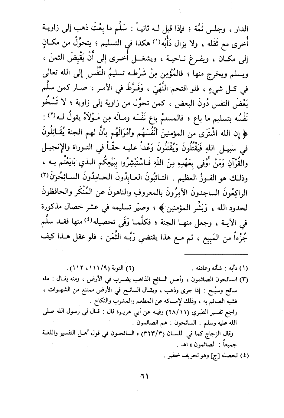الدَّار وَجلسَ ثمَّة فَإِذا قيل لَهُ ثَانِيًا سلم مَا بِعْت ذهب إِلَى زَاوِيَة أُخْرَى مَعَ ثقله وَلَا يزَال دأبه هَكَذَا فِي التَّسْلِيم يتَحَوَّل من مَكَان إِلَى مَكَان ويفرغ نَاحيَة ويشغل أُخْرَى إِلَى أَن يقبض الثّمن وَيسلم وَيخرج مِنْهَا فالمؤمن من شَرطه تَسْلِيم النَّفس إِلَى الله تَعَالَى فِي كل شَيْء فَلَو اقتحم النَّهْي وفرط فِي الْأَمر صَار كمن سلم بعض النَّفس دون الْبَعْض كمن تحول من زَاوِيَة إِلَى زَاوِيَة لَا تسخو نَفسه بِتَسْلِيم مَا بَاعَ فالمسلم بَاعَ نَفسه وَمَاله من مَوْلَاهُ يَقُول لَهُ {إِن الله اشْترى من الْمُؤمنِينَ أنفسهم وَأَمْوَالهمْ بِأَن لَهُم الْجنَّة يُقَاتلُون فِي سَبِيل الله فيقتلون وَيقْتلُونَ وَعدا عَلَيْهِ حَقًا فِي التَّوْرَاة وَالْإِنْجِيل وَالْقُرْآن وَمن أوفى بعهده من الله فاستبشروا ببيعكم الَّذِي بايعتم بِهِ وَذَلِكَ هُوَ الْفَوْز الْعَظِيم التائبون العابدون الحامدون السائحون الراكعون الساجدون الآمرون بِالْمَعْرُوفِ والناهون عَن الْمُنكر والحافظون لحدود الله وَبشر الْمُؤمنِينَ} وصير تَسْلِيمه فِي عشر خِصَال مَذْكُورَة فِي الْآيَة وَجعل مِنْهَا الْجنَّة فَكلما وفى تَحْصِيله مِنْهَا فقد سلم جُزْءا من الْمَبِيع ثمَّ مَعَ هَذَا يَقْتَضِي ربه الثّمن فَلَو عقل هَذَا كَيفَ