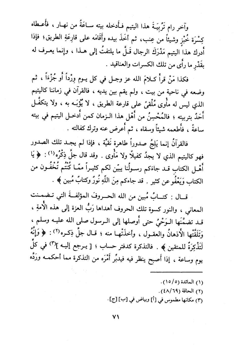 فالقرآن إِنَّمَا يلج صدورا طَاهِرَة نقية فَإِذا لم يجد تِلْكَ الصُّدُور فَهُوَ كاليتيم الَّذِي لَا يجد كَفِيلا وَلَا مأوى وَقد قَالَ جلّ ذكره {يَا أهل الْكتاب قد جَاءَكُم رَسُولنَا يبين لكم كثيرا مِمَّا كُنْتُم تخفون من الْكتاب وَيَعْفُو عَن كثير قد جَاءَكُم من الله نور وَكتاب مُبين}