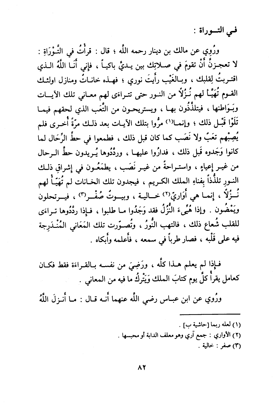 وَرُوِيَ عَن مَالك بن دِينَار رَحمَه الله قَالَ قَرَأت فِي التَّوْرَاة لَا تعجزن أَن تقوم فِي صَلَاتك بَين يَدي باكيا فَإِنِّي أَنا الله الَّذِي اقْتَرَبت لقلبك وبالغيب رَأَيْت نوري فَهَذِهِ خانات ومنازل أُولَئِكَ الْقَوْم تهَيَّأ لَهُم نزلا من النُّور حَتَّى تتراءى لَهُم مَعَاني تِلْكَ الْآيَات وبواطنها فيتلذذون بهَا ويستريحون من التَّعَب الَّذِي لحقهم فِيمَا تلوا قبل ذَلِك وَإِنَّمَا مروا بِتِلْكَ الْآيَات بعد ذَلِك مرّة أُخْرَى فَلم يصبهم تَعب وَلَا نصب كَمَا كَانَ قبل ذَلِك فطمعوا فِي حط الرّحال لما كَانُوا وجدوه قبل ذَلِك فَدَارُوا عَلَيْهَا ورددوها يُرِيدُونَ حط الرّحال من غير إعياء واستراحة من غير نصب يطمعون فِي إشراق ذَلِك النُّور تلذذا بِفنَاء الْملك الْكَرِيم فيجدون تِلْكَ الْخَانَات لم تهَيَّأ لَهُم نزلا إِنَّمَا هِيَ أواري خَالِيَة وبيوت صفر فيرتحلون ويمضون وَإِذا هيئ النزل فقد وجدوا مَا طلبُوا فَإِذا رددوها ترَاءى للقلب شُعَاع ذَلِك فالتهب النُّور وتصورت تِلْكَ الْمعَانِي المندرجة فِيهِ على قلبه فَصَارَ طَربا فِي سَمعه فَأعلمهُ وأبكاه