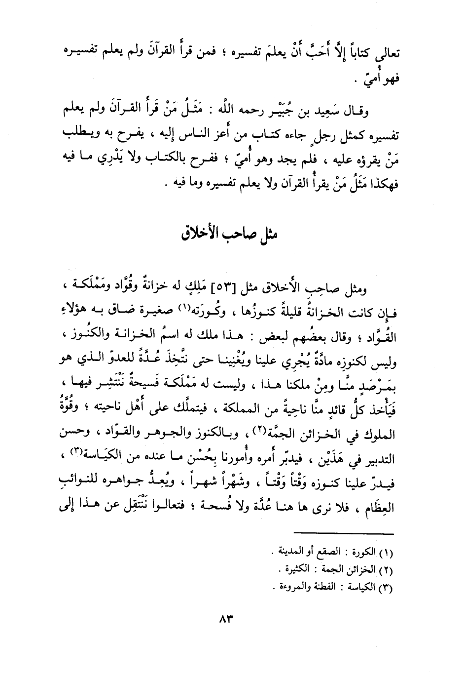مثل صَاحب الْأَخْلَاق مثل 53 ملك لَهُ خزانَة وقواد ومملكة فَإِن كَانَت الخزانة قَليلَة كنوزها وكورته صَغِيرَة ضَاقَ بِهِ هَؤُلَاءِ القواد وَقَالَ بَعضهم لبَعض هَذَا ملك لَهُ اسْم الخزانة والكنوز وَلَيْسَ لكنوزه مَادَّة يجْرِي علينا ويغنينا حَتَّى نتَّخذ عدَّة لِلْعَدو الَّذِي هُوَ بِمَرْصَد منا وَمن ملكنا هَذَا وَلَيْسَت لَهُ مملكة فسيحة ننتشر فِيهَا فَيَأْخُذ كل قَائِد منا نَاحيَة من المملكة فيتملك على أهل ناحيته وَقُوَّة الْمُلُوك فِي الخزائن الجمة وبالكنوز والجوهر والقواد وَحسن التَّدْبِير فِي هذَيْن فيدبر أمره أمورنا بِحسن مَا عِنْده من الكياسة فيدر علينا كنوزه وقتا وقتا وشهرا شهرا ويعد جواهره للنوائب الْعِظَام فَلَا نرى هَا هُنَا عدَّة وَلَا فسحة فتعالوا ننتقل عَن هَذَا إِلَى