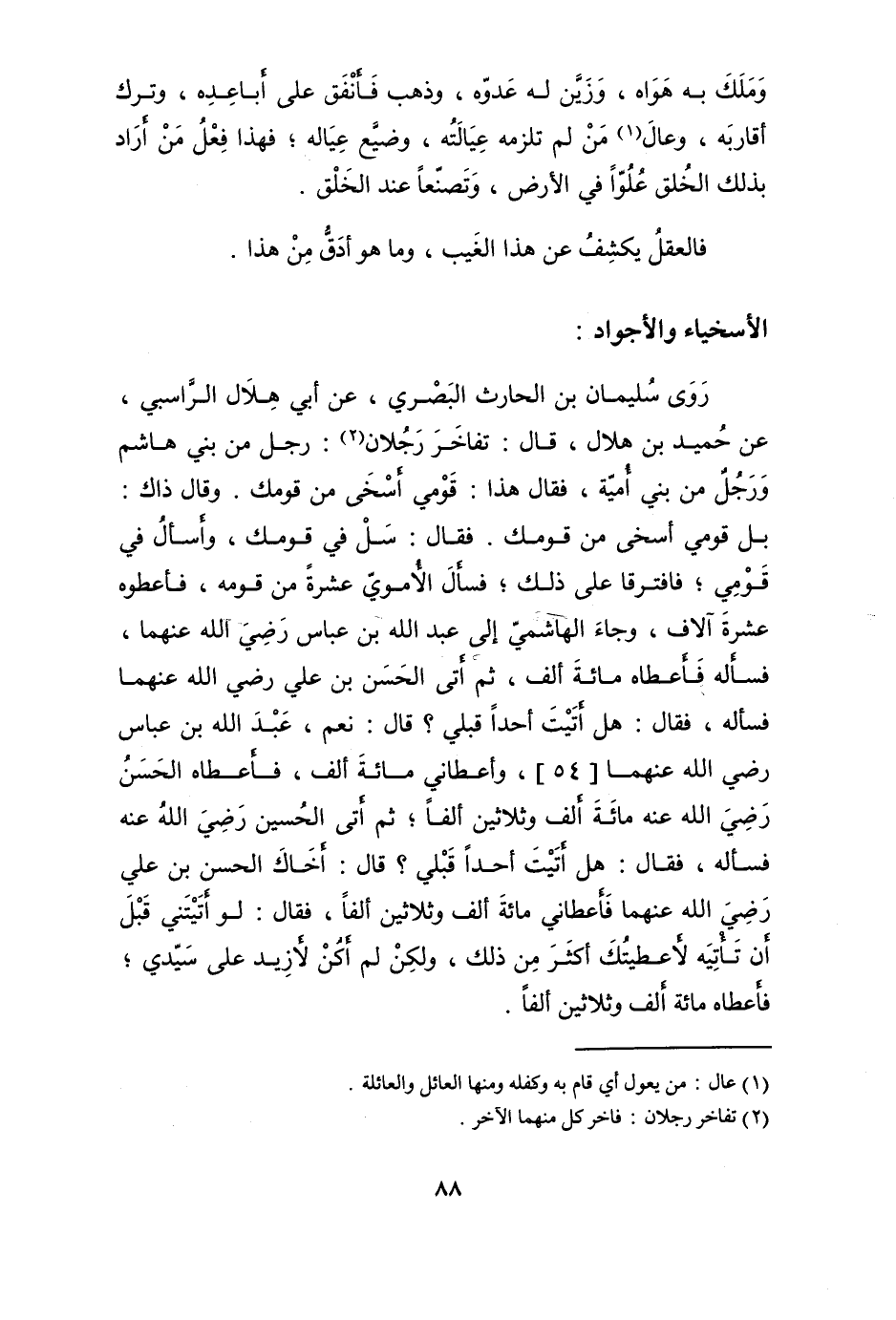 روى سُلَيْمَان بن الْحَارِث الْبَصْرِيّ عَن أبي هِلَال الرَّاسِبِي عَن حميد بن هِلَال قَالَ تفاخر رجلَانِ رجل من بني هَاشم وَرجل من بني أُميَّة فَقَالَ هَذَا قومِي أسخى من قَوْمك وَقَالَ ذَاك بل قومِي أسخى من قَوْمك فَقَالَ سل فِي قَوْمك وأسأل فِي قومِي فَافْتَرقَا على ذَلِك فَسَأَلَ الْأمَوِي عشرَة من قومه فَأَعْطوهُ عشرَة آلَاف وَجَاء الْهَاشِمِي إِلَى عبد الله بن عَبَّاس رَضِي الله عَنْهُمَا فَسَأَلَهُ فَأعْطَاهُ مائَة ألف ثمَّ أَتَى الْحسن بن عَليّ رَضِي الله عَنْهُمَا فَسَأَلَهُ فَقَالَ هَل أتيت أحدا قبلي قَالَ نعم عبد الله بن عَبَّاس رَضِي الله عَنْهُمَا 54 وَأَعْطَانِي مائَة ألف فَأعْطَاهُ الْحسن رَضِي الله عَنهُ مائَة ألف وَثَلَاثِينَ ألفا ثمَّ أَتَى الْحُسَيْن رَضِي الله عَنهُ فَسَأَلَهُ فَقَالَ هَل أتيت أحدا قبلي قَالَ أَخَاك الْحسن بن عَليّ رَضِي الله عَنْهُمَا فَأَعْطَانِي مائَة ألف وَثَلَاثِينَ ألفا فَقَالَ لَو أتيتني قبل أَن تَأتيه لأعطيتك اكثر من ذَلِك وَلَكِن لم أكن لأزيد على سَيِّدي فَأعْطَاهُ مائَة ألف وَثَلَاثِينَ ألفا