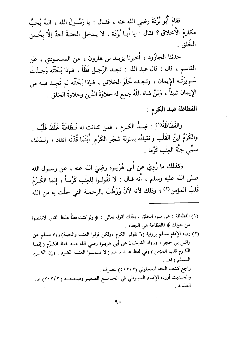 وَكَذَلِكَ مَا رُوِيَ عَن أبي هُرَيْرَة رَضِي الله عَنهُ عَن رَسُول الله صلى الله عَلَيْهِ وَسلم (أَنه قَالَ لَا تَقولُوا للعنب كرما إِنَّمَا الْكَرم قلب الْمُؤمن) وَذَلِكَ لِأَنَّهُ لَان وَرطب بِالرَّحْمَةِ الَّتِي حلت بِهِ من الله