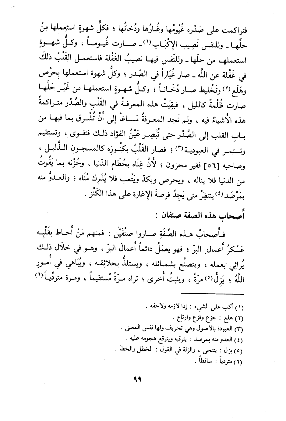 فأصحاب هَذِه الصّفة صنفين فَمنهمْ من أحَاط بِقَلْبِه عَسْكَر أَعمال الْبر فَهُوَ يعْمل دَائِما أَعمال الْبر وَهُوَ فِي خلال ذَلِك يرائي بِعَمَلِهِ ويتصنع بشمائله ويستلذ بخلائقه ويباهي فِي أُمُور الله يزل مرّة وَيثبت أُخْرَى ترَاهُ مرّة مُسْتَقِيمًا وَمرَّة مترديا