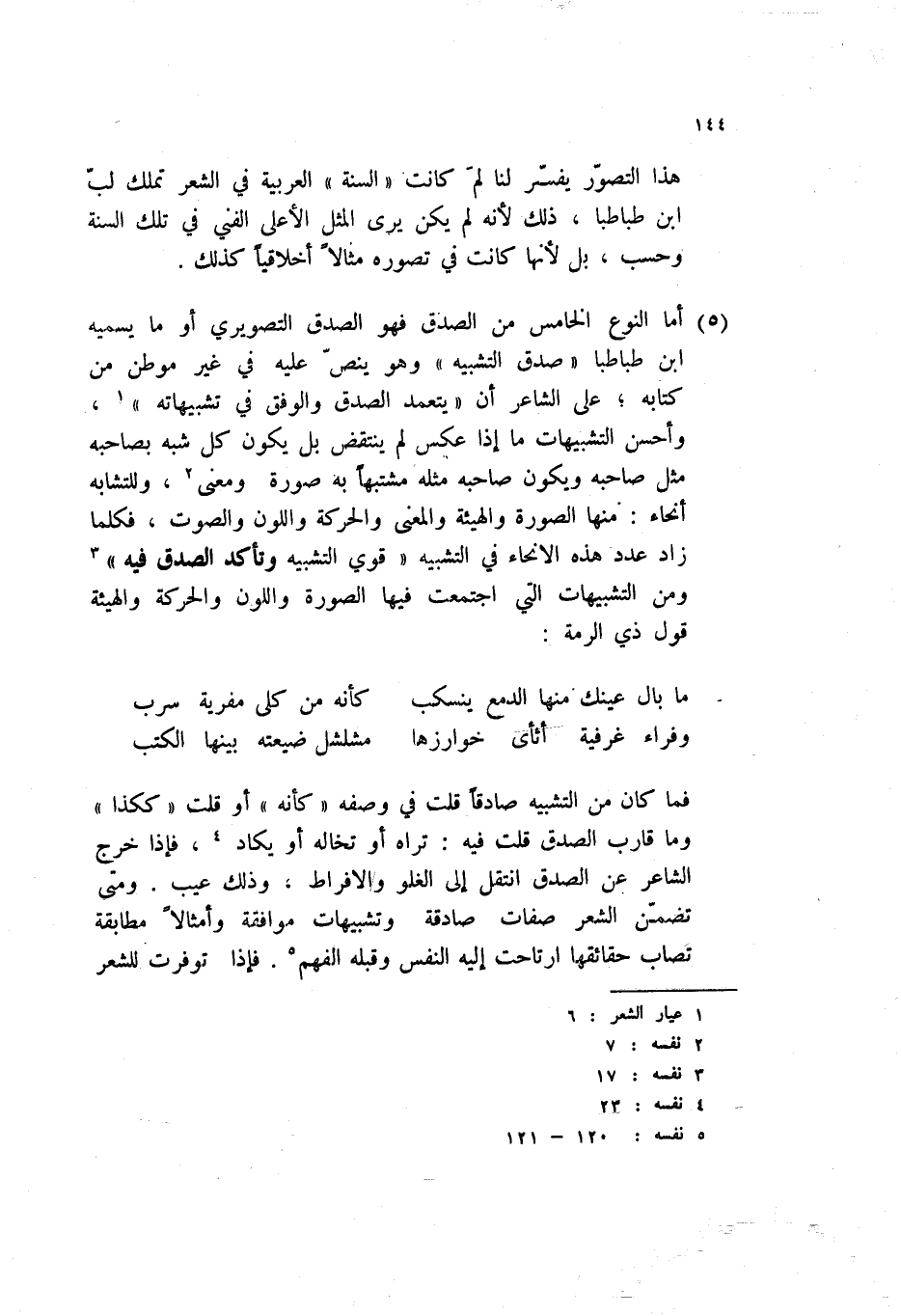 (5) أما النوع الخامس من الصدق فهو الصدق التصويري أو ما يسميه ابن طباطبا " صدق التشبيه " وهو ينص عليه في غير موطن من كتابه؛ على الشاعر أن " يتعمد الصدق والوفق في تشبيهاته " (1) ، وأحسن التشبيهات ما إذا عكس لم ينتقض بل يكون كل شبه بصاحبه مثل صاحبه ويكون صاحبه مثله مشتبهاً به صورة ومعنى (2) ، وللتشابه أنحاء: منها الصورة والهيئة والمعنى والحركة واللون والصوت، فكلما زاد عدد هذه الأنحاء في التشبيه " قوي التشبيه وتأكد الصدق فيه " (3) ومن التشبيهات التي أجمعت فيها الصورة واللون والحركة والهيئة قول ذي الرمة: