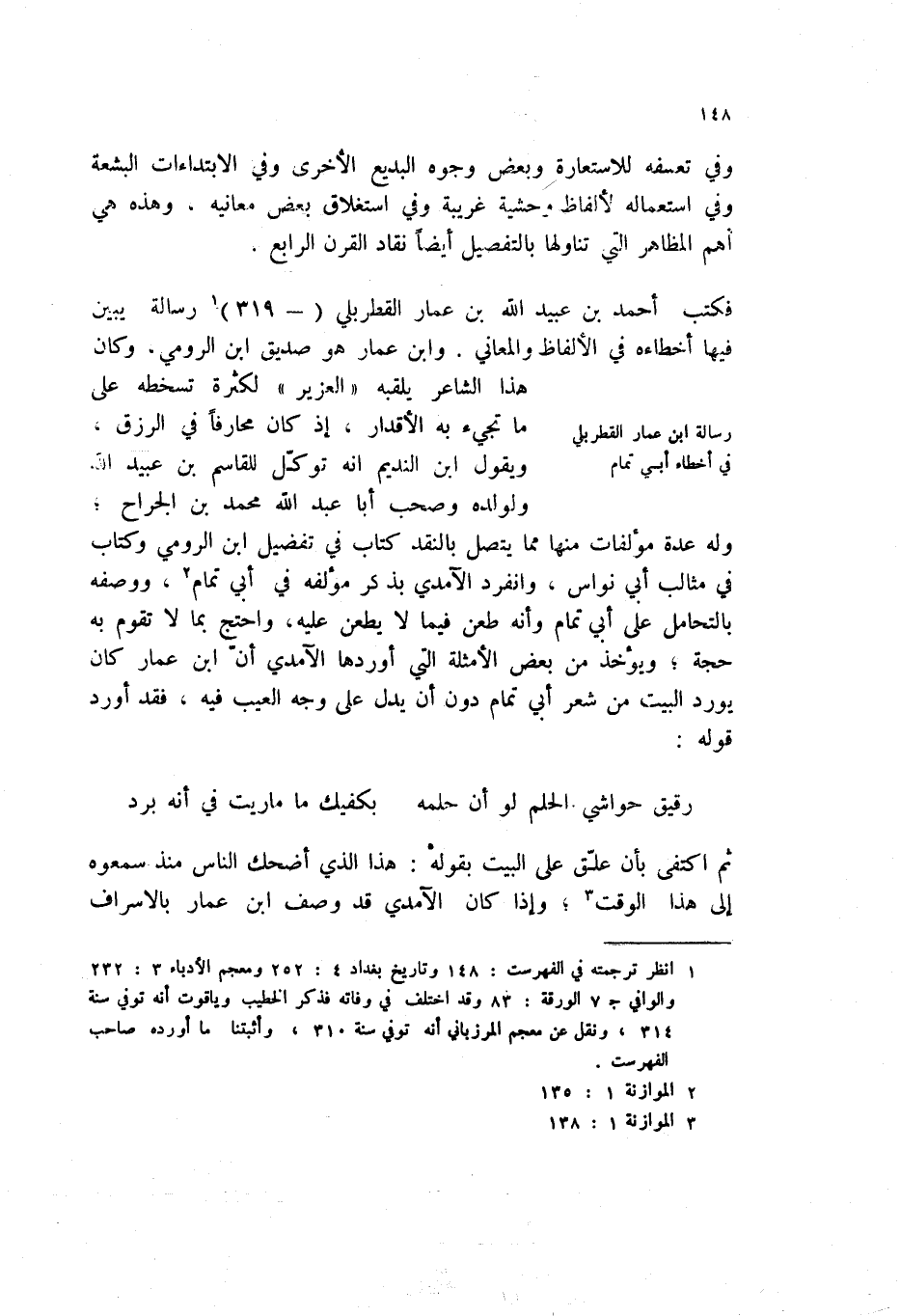 فكتب أحمد بن عبيد الله بن عمار القطريلي (- 319) (1) رسالة يبين فيها أخطاءه في الألفاظ والمعاني، وأبن عمار هو صديق أبن الرومي، وكان هذا الشاعر يلقبه " العزير " لكثرة تسخطه على ما تجيء به الأقدار، إذ كان محارفاً في الرزق، ويقول أبن النديم أنه توكل للقاسم بن عبيد الله ولوالده وصحب أبا عبد الله محمد بن الجراح؛ وله عدة مؤلفات منها مما يتصل بالنقد كتاب في تفضيل أبن الرومي وكتاب في مثالب أبي نواس، وأنفرد الآمدي بذكر مؤلفه في أبي تمام (2) ، ووصفه بالتحامل على أبي تمام وأنه طعن فيما لا يطعن عليه، وأحتج بما لا تقوم به حجة؛ ويؤخذ من بعض الأمثلة التي أوردها الآمدي أن أبن عمار كان يورد البيت من شعر أبي تمام دون أن يدل على وجه العيب فيه، فقد أورد قوله: