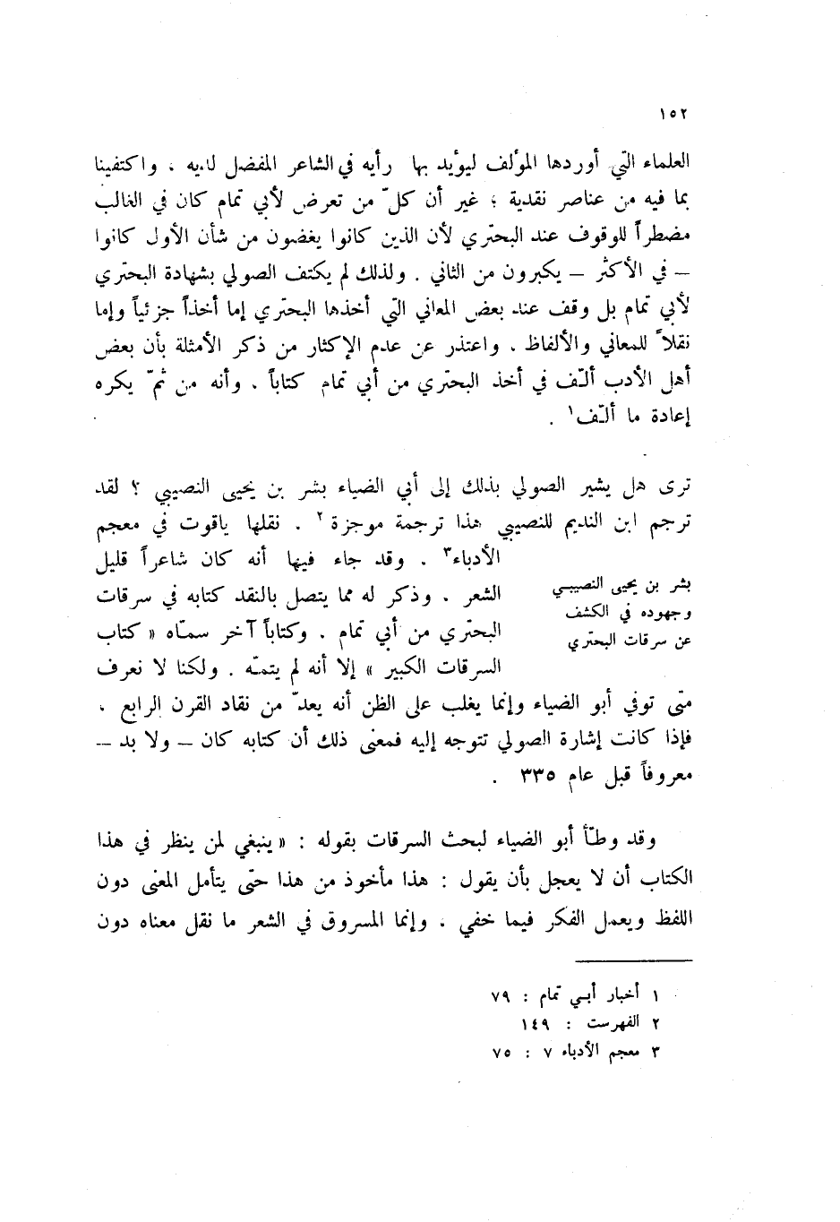 ترى هل يشير الصولي بذلك إلى أبي الضياء بشر بن يحيى النصيبي؟ لقد ترجم ابن النديم للنصيبي هذا ترجمة موجزة (2) . نقلها ياقوت في معجم الأدباء (3) . وقد جاء فيها أنه كان شاعراً قليل الشعر، وذكر له مما يتصل بالنقد كتابه في سرقات البحتري من أبي تمام، وكتاباً آخر سماه " كتاب السرقات الكبير " إلا أنه لم يتممه. ولكنا لا نعرف متى توفي أبو الضياء وغنما يغلب على الظن انه يعد من نقاد القرن الرابع، فإذا كانت إشارة الصولي تتوجه إليه فمعنى ذلك ان كتابه كان - ولابد - معروفاً قبل عام 335.