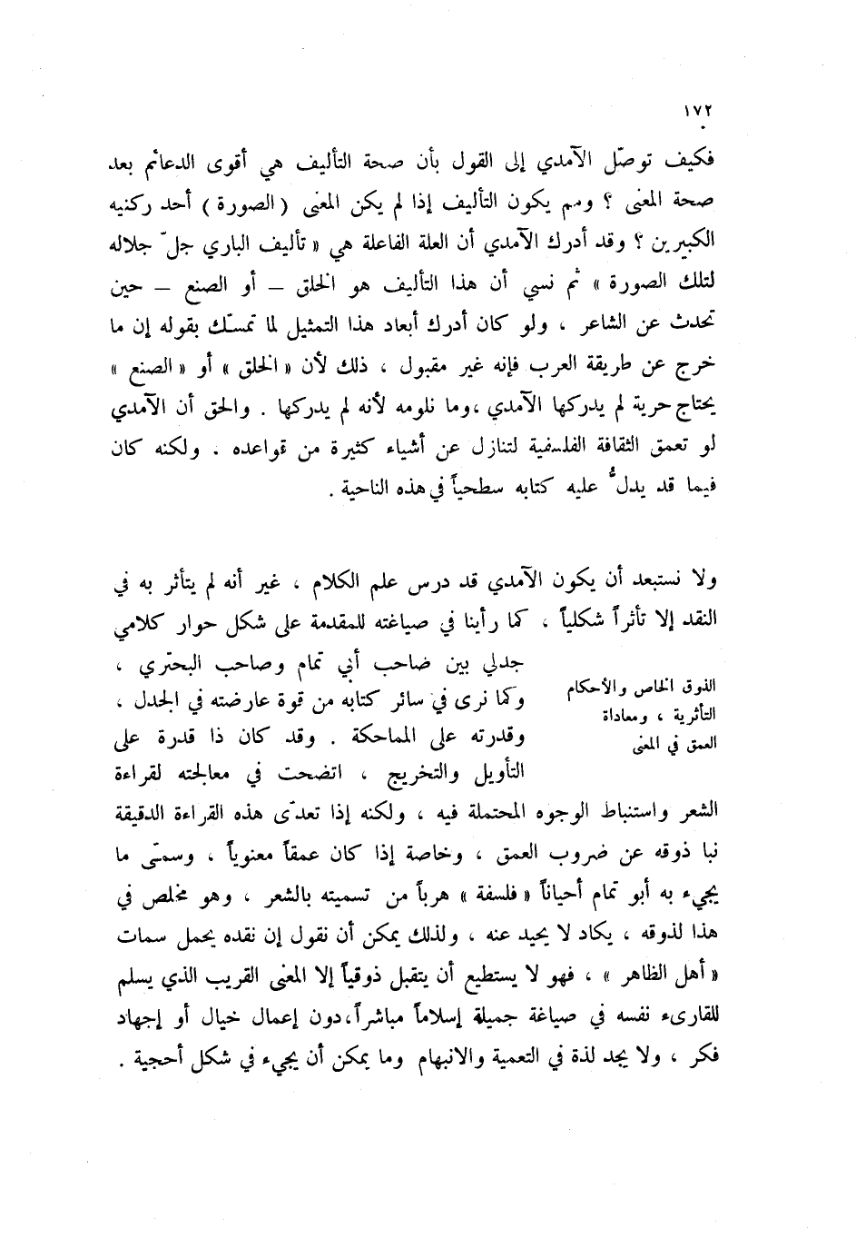 فكيف توصل الآمدي إلى القول بأن صحة التأليف هي أقوى الدعائم بعد صحة المعنى؟ ومم يكون التأليف إذا لم يكن المعنى (الصورة) أحد ركنيه الكبيرين؟ وقد أدرك الآمدي أن العلة الفاعلة هي " تأليف الباري جل جلاله لتلك الصورة " ثم نسي أن هذا التأليف هو الخلق - أو الصنع - حين تحدث عن الشاعر، ولو كان أدرك أبعاد هذا التمثيل لما تمسك بقوله إن ما خرج عن طريقة العرب فإنه غير مقبول، ذلك لأن " الخلق " أو " الصنع " يحتاج حرية لم يدركها الآمدي، وما نلومه لأنه لم يدركها. والحق أن الآمدي لو تعمق الثقافة الفلسفية لتنازل عن أشياء كثير من قواعده، ولكنه كان فيما قد يدل عليه كتابه سطحياً في هذه الناحية.