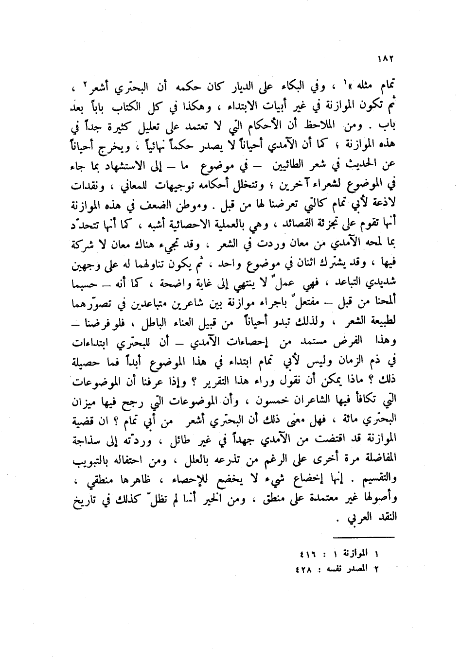 تمام مثله " (1) ، وفي البكاء على الديار كان حكمه أن البحتري أشعر (2) ، ثم تكون الموازنة في غير أبيات الابتداء، وهكذا في كل الكتاب باباً بعد باب. ومن الملاحظ أن الأحكام أن الأحكام التي لا تعتمد على تعليل كثيرة جداً في هذه الموازنة؛ كما أن الآمدي أحياناً لا يصدر حكماً نهائياً، ويخرج أحياناً عن الحديث في شعر الطائيين - في موضوع ما - إلى الاستشهاد بما جاء في الموضوع لشعراء آخرين؛ وتتخلل أحكامه توجيهات للمعاني، ونقدات لاذعة لأبي تمام كالتي تعرضنا لها من قبل. وموطن الضعف في هذه الموازنة أنها تقوم على تجزئة القصائد، وهي بالعملية الاحصائية أشبه، كما أنها تتحدد بما لمحه الآمدي من مهان وردت في الشعر، وقد تجيء هناك معان لا شركة فيها، وقد يشترك اثنان في موضوع واحد. ثم يكون تناولها له على وجهين شديدي التباعد، فهي عمل لا ينتهي إلى غاية واضحة، كما أنه - حسبما ألمحنا من قبل - مفتعل باجراء موازنة بين شاعرين متباعدين في تصورهما لطبيعة الشعر، ولذلك تبدو أحياناً من قبيل العناء الباطل، فلو فرضنا - وهذا الفرض مستمد من إحصاءات الآمدي - أن للبحتري ابتداءات في ذم الزمان وليس لأبي تمام ابتداء في هذا الموضوع أبداً فما حصيلة ذلك؟ ماذا يمكن أن نقول وراء هذا التقرير؟ وإذا عرفنا أن الموضوعات التي تكافأ فيها الشاعران خمسون، وأن الموضوعات التي رجح فيها ميزان البحتري مائة، فهل معنى ذلك أن البحتري أشعر من أبي تمام؟ إن قضية الموازنة قد اقتضت من الآمدي جهداً في غير طائل، وردته إلى سذاجة المفاضلة مرة أخرى على الرغم من تذرعه بالعلل، ومن احتفاله بالتبويب والتقسيمز إنها إخضاع شيء لا يخضع للإحصاء، ظاهرها منطقي، وأصولها غير معتمدة على منطق، ومن الخير أنها لم تظل كذلك في تاريخ النقد العربي.