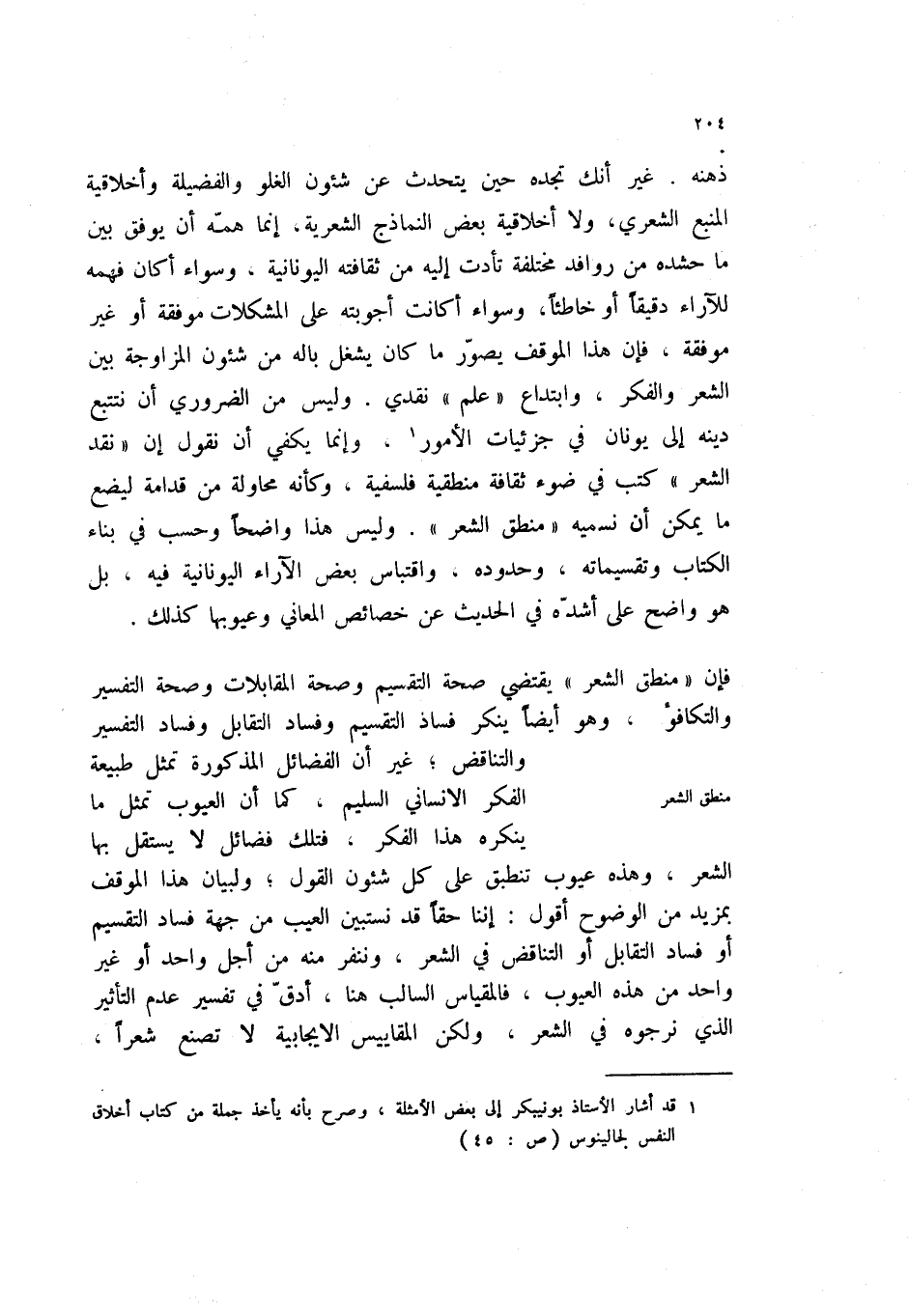 فإن " منطق الشعر " يقتضي صحة التقسيم وصحة المقابلات وصحة التفسير والتكافؤ، وهو أيضاً ينر فساد التقسيم وفساد التقابل وفساد التفسير والتناقض؛ غير أن الفضائل المذكورة تمثل طبيعة الفكر الإنساني السليم، كما أن العيوب تمثل ما ينكره هذا الفكر، فتلك فضائل لا يستقل بها الشعر، وهذه عيوب تنطبق على كل شئون القول؛ ولبيان هذا الموقف بمزيد من الوضوح أقول: إننا حقاً قد نستبين العيب من جهة فساد التقسيم أو فساد التقابل أو التناقض في الشعر، وننفر منه من أجل واحد أو غير واحد من هذه العيوب، فالمقياس السالب هنا، أدق في تفسير عدم التأثير الذي نرجوه في الشعر، ولكن المقاييس الإيجابية لا تصنع شعراً،