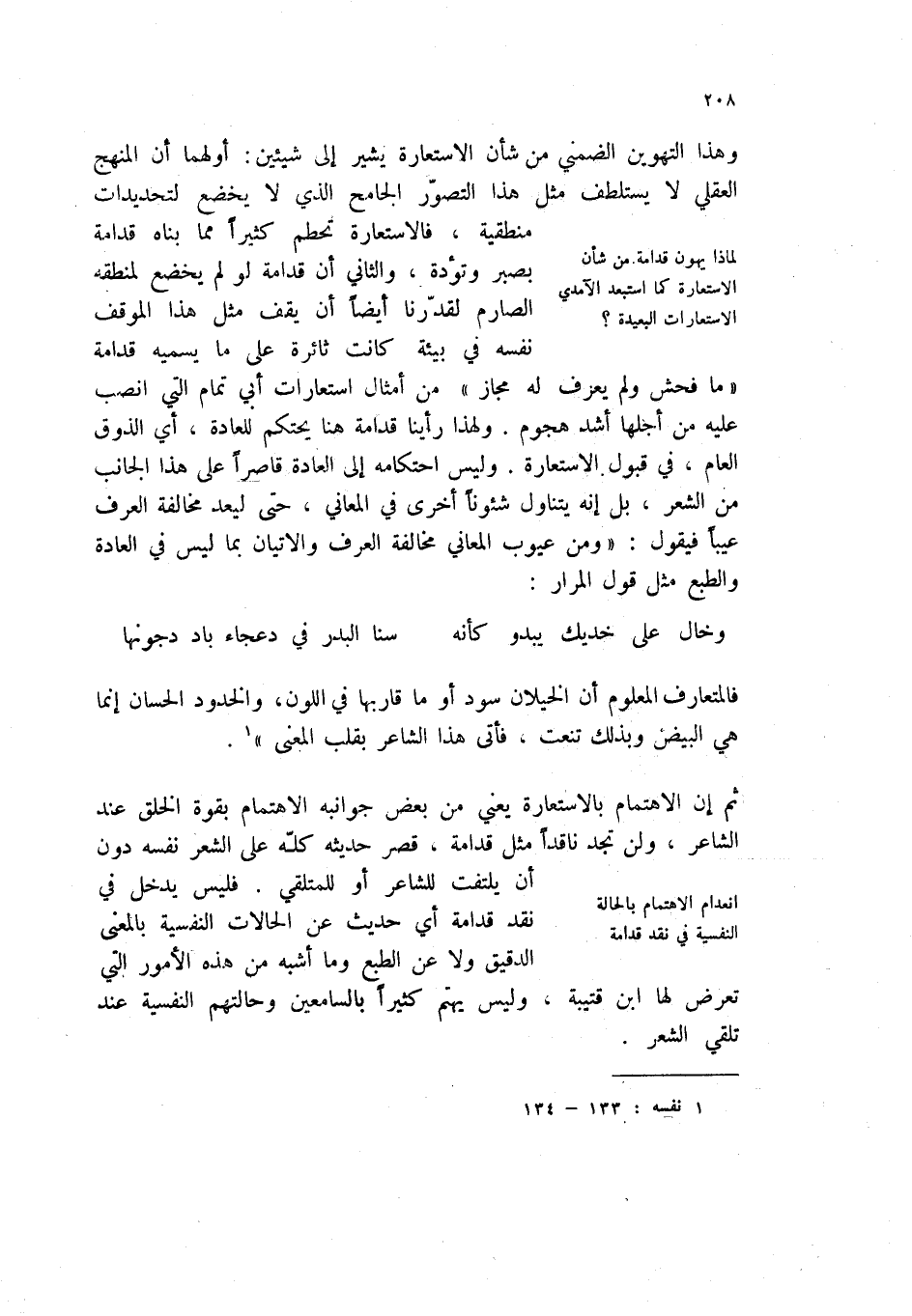 ثم أن الاهتمام بالاستعارة يعني من بعض جوانبه الاهتمام بقوة الخلق عند الشاعر، ولن تجد ناقداً مثل قدامة، قصر حديثه كله على الشعر نفسه دون أن يلتفت للشاعر أو للمتلقي. فليس يدخل في نقد قدامة أي حديث عن الحالات النفسية بالمعنى الدقيق ولا عن الطبع وما أشبه من هذه الأمور التي تعرض لها ابن قتيبة، وليس يهتم كثيراً بالسامعين وحالتهم النفسية عند تلقي الشعر.