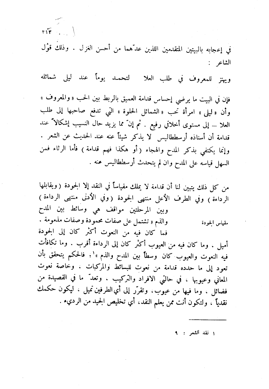 ويهتز للمعروف في طلب العلا ... لتحمد يوماً عند ليلى شمائله فإن في البيت ما يرضي إحساس قدامة العميق بالربط بين الحب " والمعروف " وان " ليلى " امرأة تحب (الشمائل الحلوة " التي تدفع صاحبها إلى طلب العلا - إلى مستوى أخلاقي رفع. ثم إن مما يزيد حال النسيب إشكالاً عند قدامة ان أستاذه أرسططاليس لا يذكر شيئاً عنه عند الحديث عن الشعر، وغنما يكتفي بذكر المدح والهجاء (أو هكذا فهم قدامة) فأما الرثاء فمن السهل قياسه على المدح وان لم يتحدث ارسططاليس عنه.