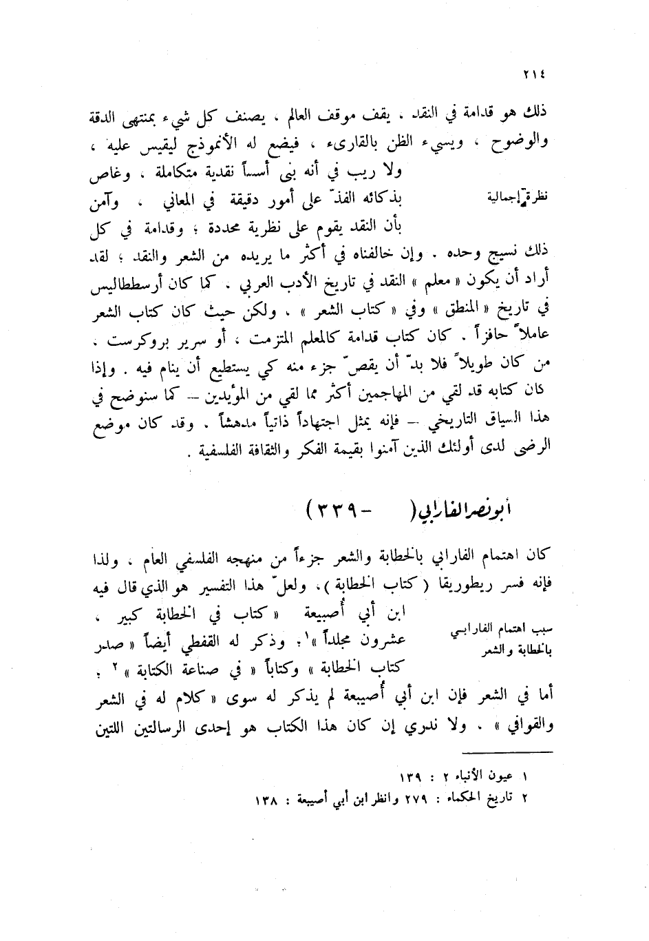 كان اهتمام الفارابي بالخطابة والشعر جزءاً من منهجه الفلسفي العام، ولذا فإنه فسر ريطوريقا (كتاب الخطابة) ، ولعل هذا التفسير هو الذي قال فيه ابن أبي أصبعية " كتاب في الخطابة كبير، عشرون مجلداً " (1) ؛ وذكر له القفطي أيضاً " صدر كتاب الخطابة " وكتاباً " في صناعة الكتابة " (2) ؛ أما في الشعر فإن ابن أبي أصبيعة لم يذكر له سوى " كلام له في الشعر والقوافي "، ولا ندري إن كان هذا الكتاب هو إحدى الرسالتين اللتين