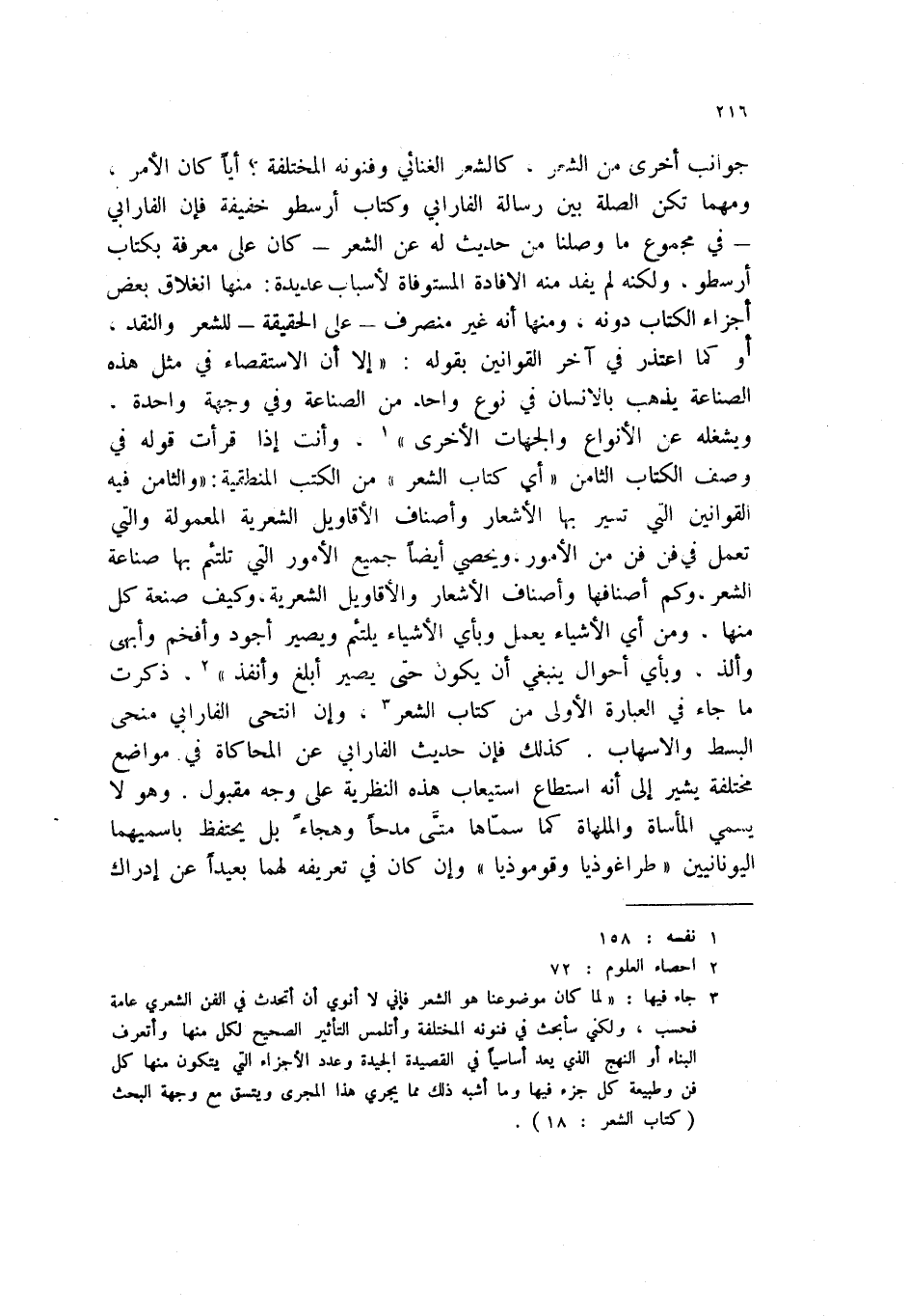 جوانب أخرى من الشعر، كالشعر الغنائي وفنونه المختلفة؟ أياً كان الامر، ومهما تكن الصلة بين رسالة الفارابي وكتاب ارسطو خفيفة فإن الفارابي - في مجموع ما وصلنا من حديث له عن الشعر - كان على معروفة بكتاب ارسطو، ولكنه لم يفد منه الإفادة المستوفاة لأسباب عديدة: منها انغلاق بعض أجزاء الكتاب دونه، ومنها أنه غير منصرف - على الحقيقة - للشعر والنقد، أو كما اعتذر في آخر القوانين بقوله: " إلا أن الاستقصاء في مثل هذه الصناعة يذهب بالإنسان في نوع واحد من الصناعة وفي وجهة واحدة، ويشغله عن الأنواع والجهات الأخرى " (1) ، وأنت إذا قرأت قوله في وصف الكتاب الثامن " أي كتاب الشعر " من الكتب المنطقية: " والثامن فيه القوانين التي تسير بها الأشعار وأصناف الأقاويل الشعرية المعمولة والتي تعمل في فن من الامور، ويحصي أيضاً جميع الأمور التي تلتئم بها صناعة الشعر، وكم أصنافها وأصناف الأشعار والأقاويل الشعرية، وكيف صنعة كل منها، ومن أي الأشياء يعمل وبأي الأشياء يلتئم ويصير أجود وأفخم وأبهى وألذ، وبأي أحوال ينبغي ان يكون حتى يصير أبلغ وأنفذ " (2) ، ذكرت ما جاء في العبارة الأولى من كتاب الشعر (3) ، وغن انتحى الفارابي منحى البسط والإسهاب. كذلك فإن حديث الفارابي عن المحاكاة في مواضع مختلفة يشير إلى أنه استطاع استيعاب هذه النظرية على وجه مقبول. وهو لا يسمى المأساة والملهاة ما سماها متى مدحاً وهجاء بل يحتفظ باسميهما اليونانيين " طراغوذيا وقوموذيا " وإن كان في تعريفه لهما بعيداً عن إدراك