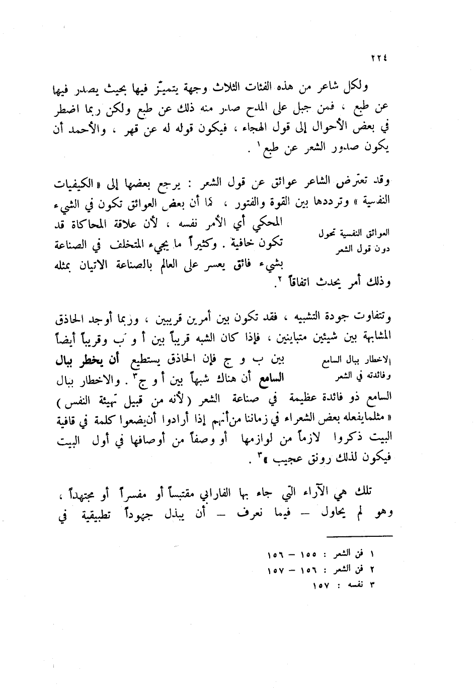 وقد تعترض الشاعر عوائق عن قول الشعر: يرجع بعضها إلى " الكيفيات النفسية " وترددها بين القوة والفتور، كما ان بعض العوائق تكون في الشيء المحكي أي الأمر نفسه، لان علاقة المحاكاة قد تكون خافية. وكثيراً ما يجيء المتخلف في الصناعة بشيء فائق يعسر على العالم بالصناعة الإتيان بمثله وذلك أمر يحدث اتفاقاً (2) .