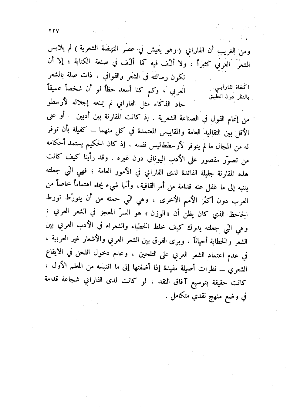 ومن الغريب أن الفارابي (وهو يعيش في عصر النهضة الشعرية) لم يلابس الشعر العربي كثيراً، ولا ألف فيه كما ألف في صنعة الكتابة؛ إلا أن تكون رسالته في الشعر والقوافي، ذات صلة بالشعر العربي؛ وكم كنا أسعد حظاً لو أن شخصاً عميقاً حاد الذكاء مثل الفارابي لم يمنعه إجلاله لأرسطو من إتمام القول في الصناعة الشعرية. إذ كانت المقارنة بين أدبين - أو على الأقل بين التقاليد العامة والمقاييس المعتمدة في كل منهما - كفيلة بأن توفر له من المجال ما لم يتوفر لأرسططاليس نفسه، إذ كان الحكيم يستمد أحكامه من تصور مقصور على الأدب اليوناني دون غيره. وقد رأينا كيف كانت هذه المقارنة جليلة الفائدة لدى الفارابي في الأمور العامة؛ فهي التي جعلته يتنبه إلى ما غفل عنه قدامه من أمر القافية، وأنها شيء يجد اهتماماً خاصاً من العرب دون كثر الأمم الأخرى، وهي التي حمته من أن يتورط تورط الجاحظ الذي كان يظن أن " الوزن " هو السر المعجز في الشعر العربي؛ وهي التي جعلته يدرك كيف خلط الخطباء والشعراء في الأدب العربي بين الشعر والخطابة أحياناً، ويرى الفرق بين الشعر العربي على التلحين، وعدم دخول اللحن في الإيقاع الشعري - نظرات أصيلة مفيدة إذا أضفتها إلى ما اقتبسه من المعلم الأول، كانت حقيقة بتوسيع آفاق النقد، لو كانت لدى الفارابي شجاعة قدامه في وضع منهج نقدي متكامل.