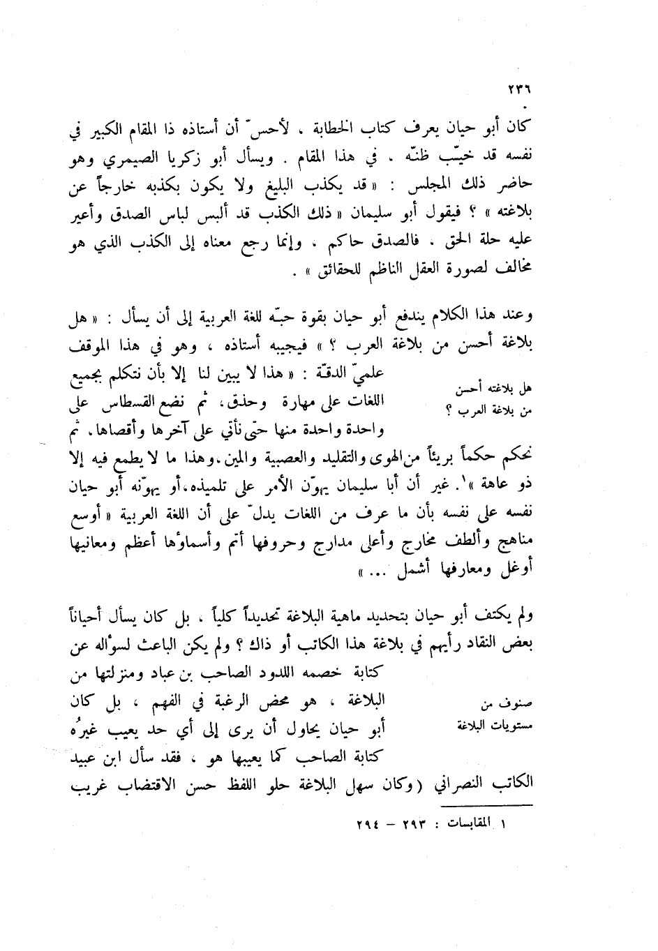 وعند هذا الكلام يندفع أبو حيان بقوة حبه للغة العربية إلى أن يسال: " هل بلاغة احسن من بلاغة العرب؟ فيجيبه أستاذه، وهو في هذا الموقف علمي الدقة: " هذا لا يبين لنا إلا بان نتكلم بجميع اللغات على مهارة وحذق، ثم نضع القسطاس على واحدة واحدة منها حتى نأتي على آخرها واقصاها، ثم نحكم حكماً بريئاً من الهوى والتقليد والعصبية والمين، وهذا ما لا يطمع فيه إلا ذو عاهة " (1) . غير أن أبا سليمان يهون الأمر على تلميذه، أو يهونه أبو حيان نفسه على نفسه بان ما عرف من اللغات يدل على ان اللغة العربية " أوسع مناهج وألطف مخارج وأعلى مدارج وحروفها أتم وأسماؤها اعظم ومعانيها أوغل ومعارفها أشمل؟ ".