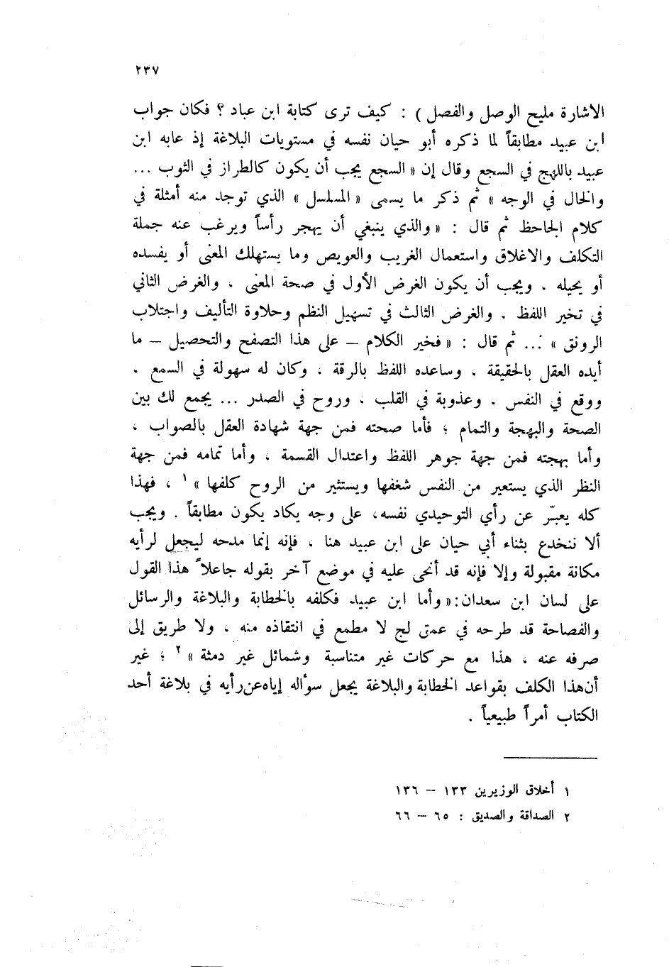 الإشارة مليح الوصل والفصل) : كيف ترى كتابة ابن عباد؟ فكان جواب ابن عبيد مطابقاً لما ذكره أبو حيان نفسه في مستويات البلاغة إذ عابه ابن عبيد باللهج في السجع وقال إن " السجع يجب أن يكون كالطراز في الثوب؟ والخال في الوجه " ثم ذكر ما يسمى " المسلسل " الذي توجد منه أمثلة في كلام الجاحظ ثم قال: " والذي ينبغي أن يهجر رأساً ويرغب عنه جملة التكلف والإغلاق واستعمال الغريب والعويص وما يستهلك المعنى أو يفسده أو يحيله، ويجب ان يكون الغرض الأول في صحة المعنى، والغرض الثاني في تخير اللفظ، والغرض الثالث في تسهيل النظم وحلاوة التأليف واحتلاب الرونق "؟ ثم قال: " فخير الكلام - على هذا التصفح والتحصيل - ما أيده العقل بالحقيقة، وساعده اللفظ بالرقة، وكان له سهولة في السمع، ووقع في النفس، وعذوبة في القلب، وروح في الصدر؟ يجمع لك بين الصحة والبهجة والتمام؛ فأما صحته فمن جهة شهادة العقل بالصواب، وأما بهجته فمن جهة جوهر اللفظ واعتدال القسمة، وأما تمامه فمن جهة النظر الذي يستعير من النفس شغفها ويستثير من الروح كلفها " (1) ، فهذا كله يعبر عن رأي التوحيدي نفسه، على وجه يكاد يكون طابقاً. ويجب ألا ننخدع بثناء أبي حيان على ابن عبيد هنا، فإنه إنما مدحه ليجعل لرأيه مكانه مقبولة وإلا فإنه قد أنحى عليه في موضع آخر بقوله جاعلاً هذا القول على لسان ابن سعدان: " وأما ابن عبيد فكلفه بالخطابة والبلاغة والرسائل والفصاحة قد طرحه في عمق لج لا مطمع في انتقاده منه. ولا طريق إلى صرفه عنه، هذا مع حركات غير متناسبة وشمائل غير دمثة " (2) ؛ غير أن هذا الكلف بقواعد الخطابة والبلاغة يجعل سؤاله إياه عن رأيه في بلاغة أحد الكتاب أمراً طبيعياً.