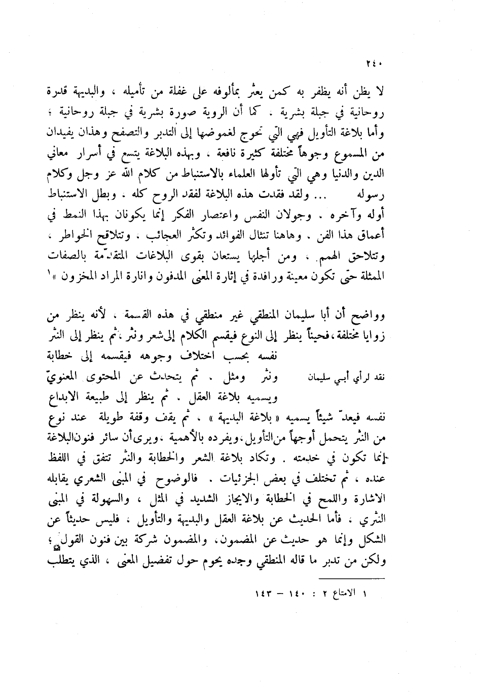 وواضح أن أبا سليمان المنطقي غير منطقي في هذه القسمة، لأنه ينظر من زوايا مختلفة، فحيناً ينظر إلى النوع فيقسم الكلام إلى شعر ونثر. ثم ينظر إلى النثر نفسه بحسب اختلاف وجوهه فيقسمه إلى خطابة ونثر ومثل. ثم يتحدث عن المحتوى المعنوي ويسميه بلاغة العقل، ثم ينظر إلى طبيعة الإبداع نفسه فيعد شيئاً يسميه " بلاغة البديهة "، ثم يقف وقفة طويلة عند نوع من النثر يتحمل أوجههاً من التأويل، ويفرده بالأهمية. ويرى ان سائر فنون البلاغة إنما تكون في خدمته. وتكاد بلاغة الشعر والخطابة والنثر تتفق في اللفظ عنده. ثم تختلف في بعض الجزئيات، فالوضوح في المبنى الشعري يقابله الإشارة واللمح في الخطابة والإيجاز الشديد في المثل، والسهولة في المبنى النثري. فأما الحديث عن بلاغة العقل والبديهة والتأويل، فليس حديثاً عن الشكل وإنما هو حديث عن المضمون، والمضمون شركة بين فنون القول؛ ولكن من تدبر ما قاله المنطقي وجده يحوم حول تفضيل المعنى، الذي يتطلب