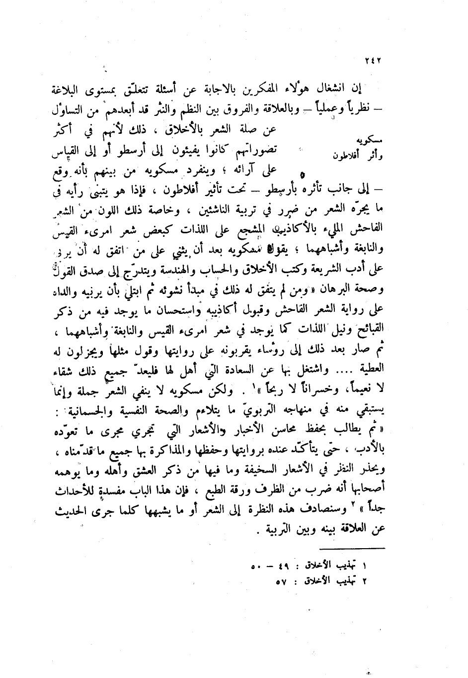 إن انشغال هؤلاء المفكرين بالإجابة عن أسئلة تتعلق بمستوى البلاغة - نظرياً وعملياً - وبالعلاقة والفروق بين النظم والنثر قد أبعدهم من التساؤل عن صلة الشعر بالأخلاق، ذلك لأنهم في أكثر تصوراتهم كانوا يفيئون إلى أرسطو أو إلى القياس على آرائه؛ وينفرد مسكويه من بينهم بأنه وقع - إلى جانب تأثره بأرسطو - تحت تأثير أفلاطون، فإذا هو يتبنى رأيه في ما يجره الشعر من ضرر في تربية الناشئين، وخاصة ذلك اللون من الشعر الفاحش المليء بالأكاذيب المشجع على اللذات كبعض شعر امرئ القيس والنابغة وأشباههما، يقول مسكويه بعد أن يثني على من أتفق له أن يرد على أدب الشريعة وكتب الأخلاق والحساب والهندسة ويتدرج إلى صدق القرن وصحة البرهان " ومن لم يتفق له ذلك في مبدأ نشوئه ثم أبتلي بأنه يربيه والدال على رواية الشعر الفاحش وقبول أكاذيبه واستحسان ما يوجد فيه من ذكر القبائح ونيل اللذات كما يوجد في شعر امرئ القيس والنابغة وأشباههما، ثم صار بعد ذلك إلى رؤساء يقربونه على روايتها وقول مثلها ويجزلون له العطية؟ واشتغل بها عن السعادة التي أهل لها فليعد جميع ذلك إلى شقاء لا نعيماً، وخسراناً لا ربحاً " (1) . ولكن مسكويه لا ينفي الشعر جملة وإنما يستبقي منه في منهاجه التربوي ما يتلاءم والصحة النفسية والجسمانية: " ثم يطالب بحفظ محاسن الأخبار والأشعار التي تجري مجرى ما تعوده بالأدب، حتى يتأكد عنده بروايتها وحفظها والمذاكرة بها جميع ما قدمناه، ويحذر النظر في الأشعار السخيفة وما فيها من ذكر العشق وأهله وما يوهمه أصحابها أنه ضرب من الظرف ورقة الطبع، فإن هذا الباب مفسدة للأحداث جداً " (2) وسنصادف هذه النظرة إلى الشعر أو ما يشبهها كلما جرى الحديث عن العلاقة بينه وبين التربية.