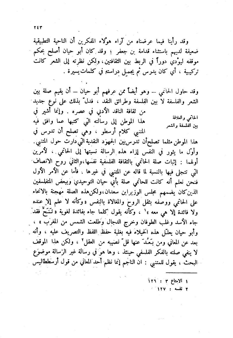 وقد حاول الحاتمي - وهو أيضاً ممن عرفهم أبو حيان - أن يقيم صلة بين الشعر والفلسفة لا بين الفلسفة وطرائق النقد، فدل بذلك على نوع جديد من ثقافة الناقد الأدبي في عصره، وإنما أشير في هذا الموطن مثلما تصلح أن تدرس بين الجهود النقدية التي دارت حول المتنبي، وأول ما يثور في النفس إزاء هذه الرسالة نسبتها إلى الحاتمي، لأمرين أولهما: إثبات صلة الحاتمي بالثقافة الفلسفية نفسها، والثاني روح الإنصاف التي تتجلى فيها بالنسبة لما قاله عن المتنبي في غيرها، فأما عن الأمر الأول فنحن نعلم أنه كانت للحاتمي صلة بأبي حيان التوحيدي وببعض المتفلسفين الذين كان يضمهم مجلس الوزير أبن سعدان، ولكن هذه الصلة مهجنة بالأنحاء على الحاتمي ووصفه بثقل الروح والمغالاة بالنفس " وكأنه لا علم إلا عنده ولا فائدة إلا هي معه " (1) ، وكأنه يقول كلما جاء بفائدة لغوية " تنح فقد جاء الأسد وغلب الطوفان وخرج الدجال وطلعت الشمس من المغرب ". وأبو حيان يعلل هذه الخيلاء فيه بغلبة حفظ اللفظ والتصريف عليه، وأنه بعد عن المعاني ومن بعد عنها قل نصيبه من العقل (2) ، ولكن هذا الموقف لا ينفي صلته بالفكر الفلسفي حينئذ، وهاهو في رسالة غير الرسالة موضوع البحث، يقول للمتنبي: أن الناجم إنما نظم أحد المعاني من قول أرسططاليس