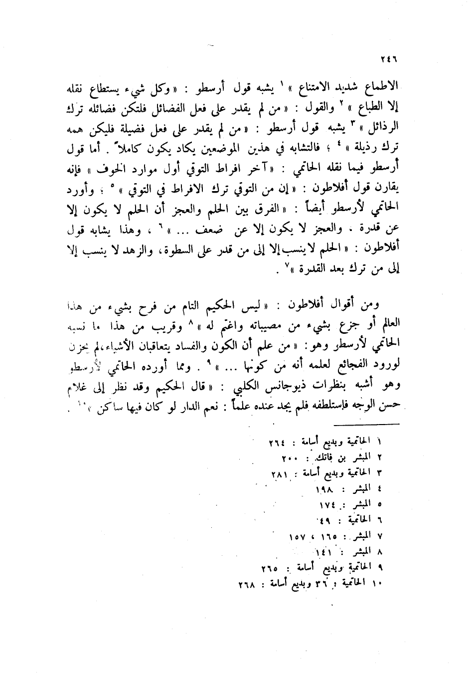 الأطماع شديد الامتناع " (1) يشبه قول أرسطو: " وكل شيء يستطاع نقله إلا الطباع " (2) والقول: " من لم يقدر على فعل الفضائل فلتكن فضائله ترك الرذائل " (3) يشبه قول أرسطو: " من لم يقدر على فعل فضيلة فليكن همه ترك رذيلة " (4) ؛ فالتشابه في هذين الموضعين يكاد يكون كاملاً. أما قول أرسطو فيما نقله أفلاطون: " إن من التوقي ترك الإفراط في التوقي " (5) ؛ وأورد الحاتمي لأرسطو أيضاً: " الفرق بين الحلم والعجز أن الحلم لا يكون إلا عن قدرة، والعجز لا يكون إلا عن ضعف؟ " (6) ، وهذا لا يشابه قول أفلاطون: " الحلم لا ينسب إلا من قدر على السطوة، والزهد لا ينسب إلا من ترك بعد القدرة " (7) .