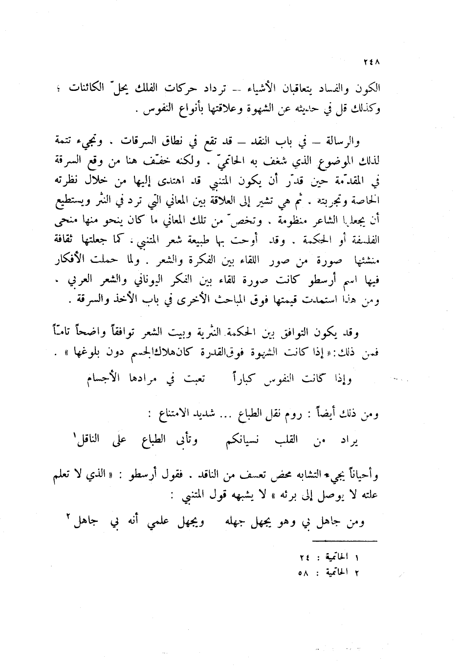 والرسالة - في باب النقد - قد تقع في نطاق السرقات، وتجيء تتمة لذلك الموضوع الذي شغف به الحاتمي، ولكنه خفف هنا من وقع السرقة في المقدمة حين قدر ان يكون المتنبي قد اهتدى غليها من خلال نظراته الخاصة وتجربته. ثم هي تشير إلى العلاقة بين المعاني التي ترد في النثر ويستطيع ان يجعلها الشاعر منظومة، وتخص من تلك المعاني المتنبي، كما جعلتها ثقافة منشئها صورة من صور اللقاء بين الفكرة والشعر. ولما حملت الأفكار فيها اسم أرسطو كانت صورة للقاء بين الفكر اليوناني والشعر العربي، ومن هذا استمدت قيمتها فوق المباحث في باب الأخذ والسرقة.
