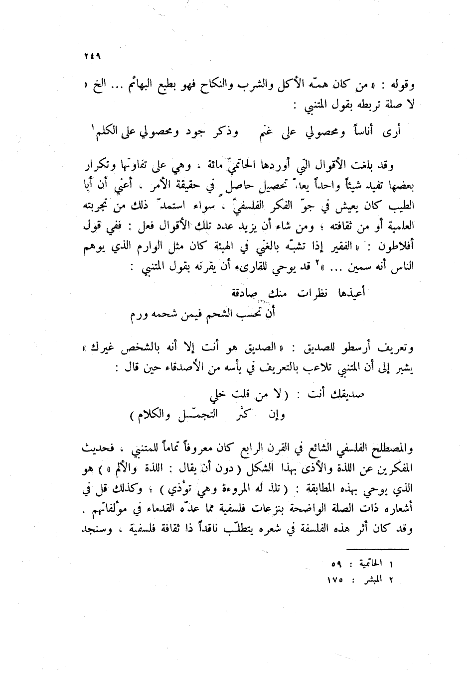صديقك أنت: (لا من قلت خلي ... وإن كثر التجمل والكلام) والمصطلح الفلسفي الشائع في القرن الرابع كان معروفاً تماماً للمتنبي، فحديث المفكرين عن اللذة والأذى بهذا الشكل (دون أن يقال: اللذة والألم) هو الذي يوحي بهذه المطابقة: (تلذ له المروءة وهي تؤذي) ؛ وكذلك قل في أشعاره ذات الصلة الواضحة بنزعات فلسفية مما عده القدماء في مؤلفاتهم. وقد كان أثر هذه الفلسفة في شعره يتطلب ناقداً ذا ثقافة فلسفية، وسنجد