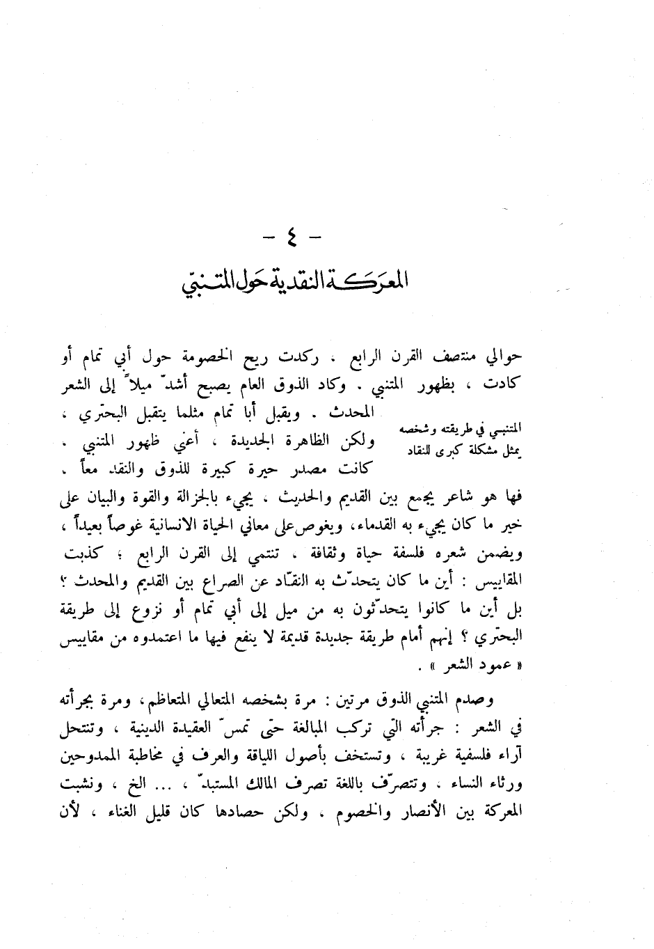 حوالي منتصف القرن الرابع. ركدت ريح الخصومة حول أبي تمام أو المحدث. ويقبل أبا تمام مثلما يتقبل البحتري، ولكن الظاهرة الجديدة، اعني ظهور المتنبي، كانت مصدر حيرة كبيرة للذوق والنقد معاً. فها هو شاعر يجمع بين القديم والحديث، يجيء بالجزالة والقوة والبيان على خير ما كان يجيء به القدماء، ويغوص على معاني الحياة الإنسانية غوصاً بعيداً، ويضمن شعره فلسفة حياة وثقافة. تنتمي إلى القرن الرابع؛ كذبت المقاييس: أين ما كان يتحدث به الناد عن الصراع بين القديم والمحدث؟ بل أين ما كانوا يتحدثون به من ميل إلى أبي تمام أو نزوع إلى طريقة البحتري؟ إنهم أمام طريقة جديدة قديمة لا ينفع فيها ما اعتمدوه من مقاييس " عمود الشعر ".