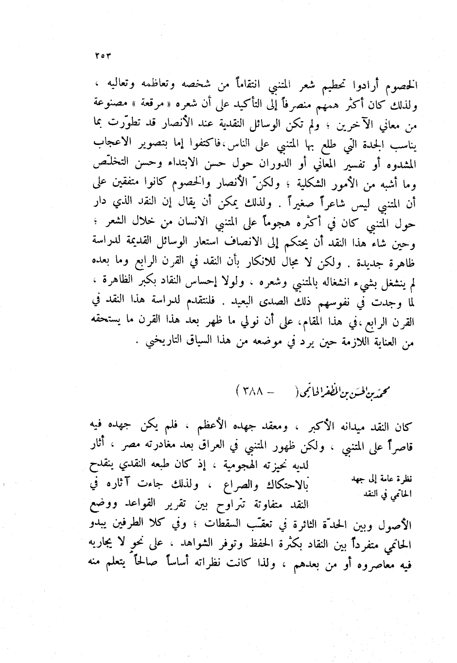 الخصوم أرادوا تحطيم شعر المتنبي انتقاماً من شخصه وتعاظمه وتعاليه، ولذلك كان اكثر همهم منصرفاً إلى التأكيد على أن شعره " مرقعة " مصنوعة من معاني الآخرين؛ ولم تكن الوسائل النقدية عند الأنصار قد تطورت بما يناسب الجدة التي طلع بها المتنبي على الناس، فاكتفوا إما بتصوير الإعجاب المشدوه أو تفسير المعاني أو الدوران حول حسن الابتداء وحسن التخلص وما أشبه من الأمور الشكلية؛ ولكن الأنصار والخصوم كانوا متفقين على أن المتنبي ليس شاعراً صغيراً. ولذلك يمكن أن يقال إن النقد الذي دار حول المتنبي كان في أكثره هجوماً على المتنبي الإنسان من خلال الشعر؛ وحين شاء هذا النقد أن يحتكم إلى الإنصاف استعار الوسائل القديمة لدراسة ظاهرة جديدة. ولكن لا مجال للإنكار بان النقد في القرن الرابع وما بعده لم ينشغل بشيء انشغاله بالمتنبي وشعره. ولولا إحساس النقاد بكبر الظاهرة. لما وجدت في نفوسهم ذلك الصدى البعيد. فلنتقدم لدراسة هذا النقد في القرن الرابع، في هذا المقام، على أن نولي ما ظهر بهد هذا القرن ما يستحقه من العناية اللازمة حين يرد في موضعه من هذا السياق التاريخي.