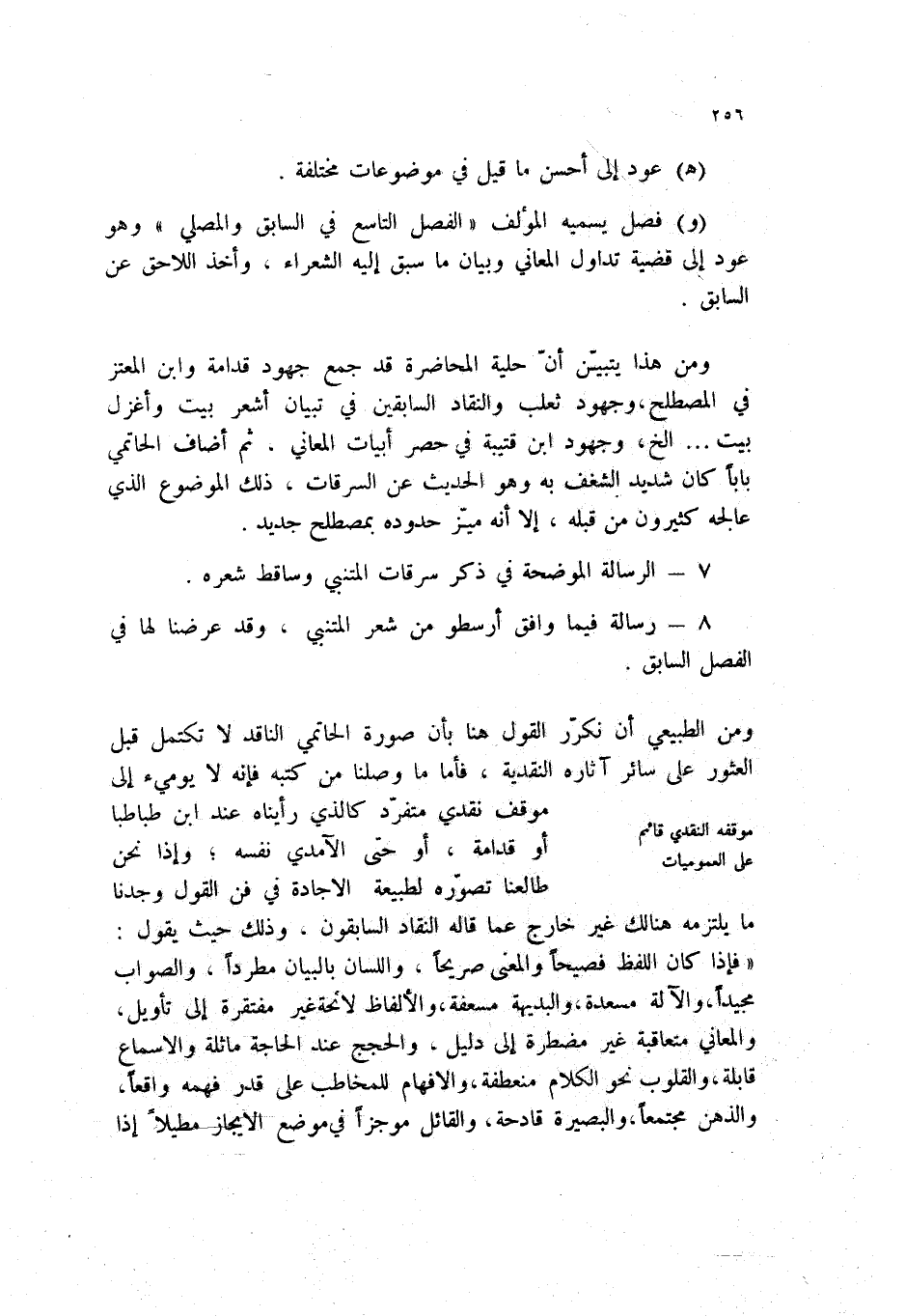 (و) فصل يسميه المؤلف " الفصل التاسع في السابق والمصلي " وهو عود إلى قضية تداول المعاني وبيان ما سبق إليه الشعراء، واخذ اللاحق عن السابق.