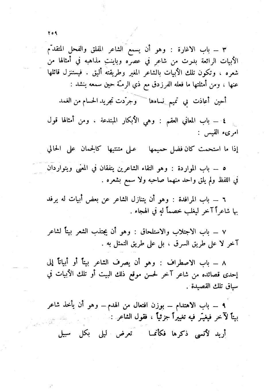 9 - باب الأهتدام - بوزن افتعال من الهدم - وهو أن يأخذ شاعر بيتاً لآخر فيغير فيه تغييراً جزئياً، فقول الشاعر: