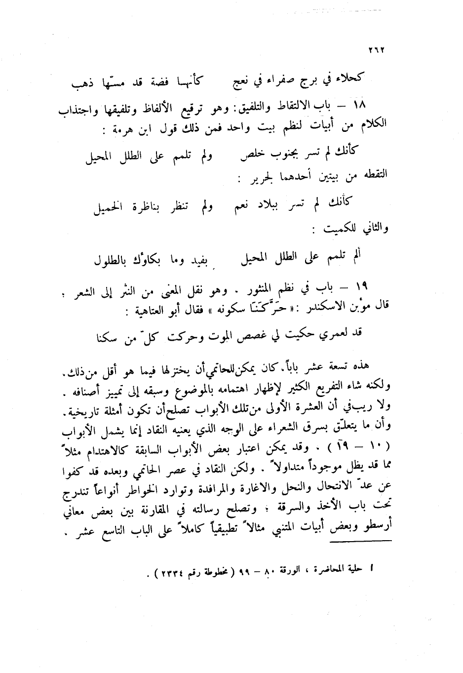 قد لعمري حكيت لي غصص الموت وحركت كل من سكنا ... هذه تسعة عشر باباً، كان يمكن للحاتمي أن يختزلها فيما هو أقل من ذلك، ولكنه شاء التفريع الكثير لإظهار اهتمامه بالموضوع وسبقه إلى تمييز أصنافه، ولا ريب في أن العشرة الأولى من تلك الأبواب تصلح أن تكون أمثلة تاريخية، وأن ما يتعلق بسرق الشعراء على الوجه الذي يعنيه النقاد إنما يشمل الأبواب (10 - 19) ، وقد يمكن اعتبار بعض الأبواب السابقة كالأهتدام مثلاً مما قد يطل موجوداً متداولاً، ولكن النقاد في عصر الحاتمي وبعده قد كفوا عن عد الانتحال والنحل والإغارة والمرافدة وتوارد الخواطر أنواعاً تندرج تحت باب الأخذ والسرقة، وتصلح رسالته في المقارنة بين بعض معاني أرسطو وبعض أبيات المتنبي مثالاً تطبيقياً كاملاً على الباب التاسع عشر