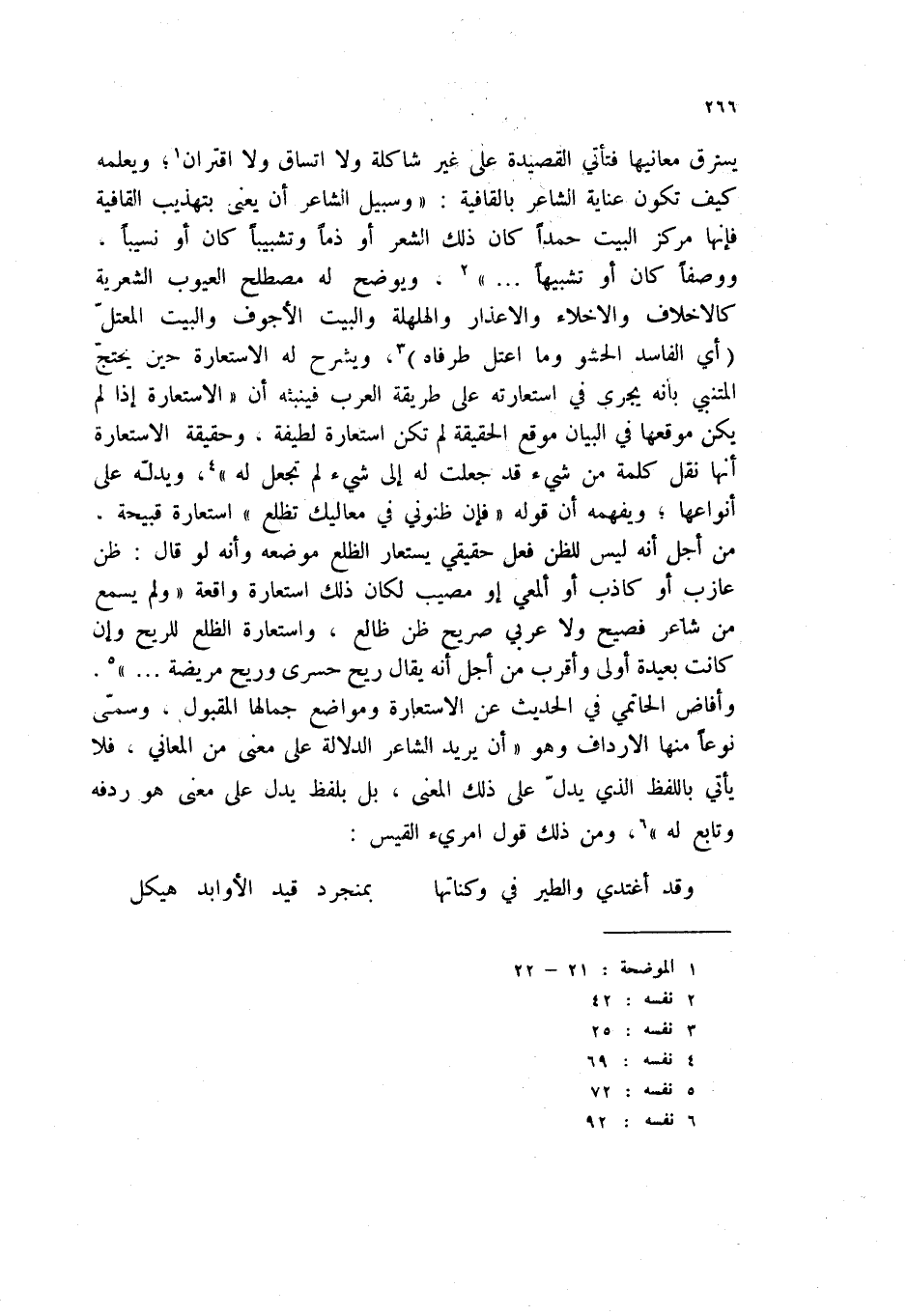 يسرق معانيها فتاتي القصيدة على غير شاكلة ولا اتساق ولا اقتران (1) ؛ ويعلمه كيف تكون عناية الشاعر بالقافية: " وسبيل الشاعر أن يعنى بتهذيب القافية فإنها مركز البيت حمداً كان ذلك الشعر أو ذماً وتشبيهاً كان أو نسيباً. ووصفاً كان أو تشبيهاً؟ " (2) ، ويوضح له مصطلح العيوب الشعرية كالاخلاف والإخلاء والأعذار والهلهلة والبيت الأجوف والبيت المعتل (أي الفاسد الحشو وما اعتل طرفاه) (3) ، ويشرح له الاستعارة حين يحتج المتنبي بأنه يجري في استعارته على طريقة العرب فينبئه ان " الاستعارة إذا لم يكن موقعها في البيان موقع الحقيقة لم تكن استعارة لطيفة، وحقيقة الاستعارة أنه نقل كلمة من شيء قد جعلت له إلى شيء لم تجعل له " (4) ، ويدله على أنواعها؛ ويفهمه أن قوله " فغن ظنوني في معاليك تظلع " استعارة قبيحة. من أجل أنه ليس للظن فعل حقيقي يستعار الظلع موضعه وانه لو قال: ظن عازب أو كاذب أو المعي أو مصيب لكان ذلك استعارة واقعة " ولم يسمع من شاعر فصيح ولا عربي صريح ظن ظالع، واستعارة الظلع للريح وإن كانت بعيدة أولى واقرب من اجل انه يقال ريح حسرى وريح مريضة؟ " (5) . وافاض الحاتمي في الحديث عن الاستعارة ومواضع جمالها المقبول، وسمى نوعاً منها الأرداف وهو " أن يريد الشاعر الدلالة على معنى من المعاني، فلا يأتي اللفظ الذي يدل على ذلك المعنى، بل بلفظ يدل على معنى هو ردفه وتابع له " (6) ، ومن ذلك قول امرئ القيس: