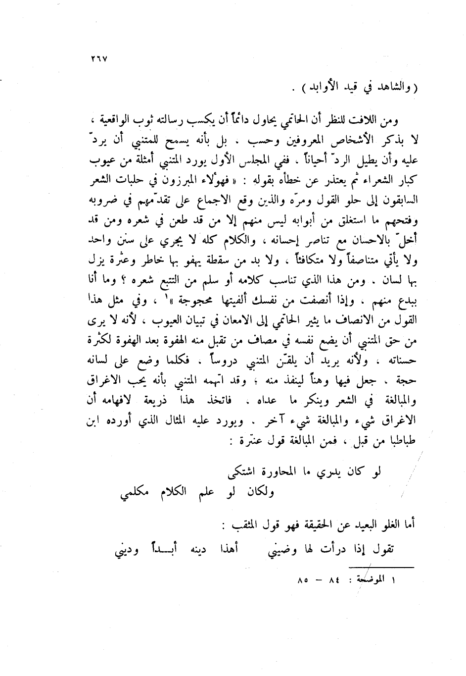 ومن اللافت للنظر أن الحاتمي يحاول دائماً أن يكسب رسالته ثوب الواقعية، لا يذكر الأشخاص المعروفين وحسب. بل بأنه يسمح للمتنبي أن يرد عليه وأن يطيل الرد أحياناً. ففي المجلس الأول يورد المتنبي أمثلة من عيوب كبار الشعراء ثم يعتذر عن خطأه بقوله: " فهؤلاء المبرزين في حلبات الشعر السابقون إلى حلو القول ومره والذين وقع الإجماع على تقدمهم في ضروبه وفتحهم ما استغلق من أبوابه ليس منهم غلا من قد طعن في شعره ومن قد أخل بالإحسان مع تناصر إحسانه، والكلام كله لا يجري على سنن واحد ولا يأتي متناصفاً ولا متكافئاً، ولابد من سقطة يهفو بها خاطر وعثرة يزل بها لسان، ومن هذا الذي تناسب كلامه أو سلم من التتبع شعره؟ وما أنا ببدع منهم، وإذا أنصفت من نفسك ألفيتها محجوجة " (1) ، وفي مثل هذا القول من الأنصاف ما يثير الحاتمي إلى الإمعان في تبيان العيوب، لأنه لا يرى من حق المتنبي أن يضع نفسه في مصاف من تقبل منه الهفوة بعد الهفوة لكثرة حسناته، ولأنه يريد أن يلقن المتنبي دروساً، فكلما وضع على لسانه حجة، جعل فيها وهناً لينفذ منه؛ وقد اتهمه المتنبي بأنه يحب الإغراق والمبالغة في الشعر وينكر ما عداه، فاتخذ هذا ذريعة لإفهامه أن الإغراق شيء والمبالغة شيء آخر، ويورد عليه المثال الذي أورده ابن طباطبا من قبل، فمن المبالغة قول عنترة: