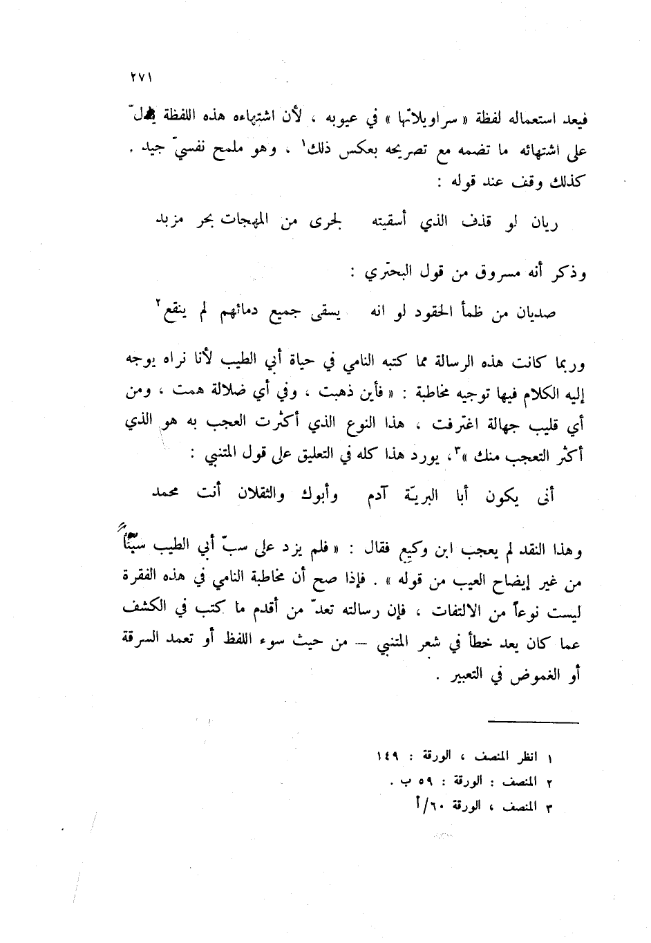 أني يكون أبا البرية آدم ... وأبوك والثقلان أنت محمد وهذا النقد لم يعجب ابن وكيع فقال: " فلم يزد على سب أبي الطيب سباً من غير إيضاح العيب من قوله ". فإذا صح أن مخاطبة النامي في هذه الفقرة ليست نوعاً من الالتفات، فإن رسالته تعد من اقدم ما كتب في الكشف عما كان يعد خطأ في شعر المتنبي - من حيث سوء اللفظ أو تعمد السرقة أو الغموض في التعبير.