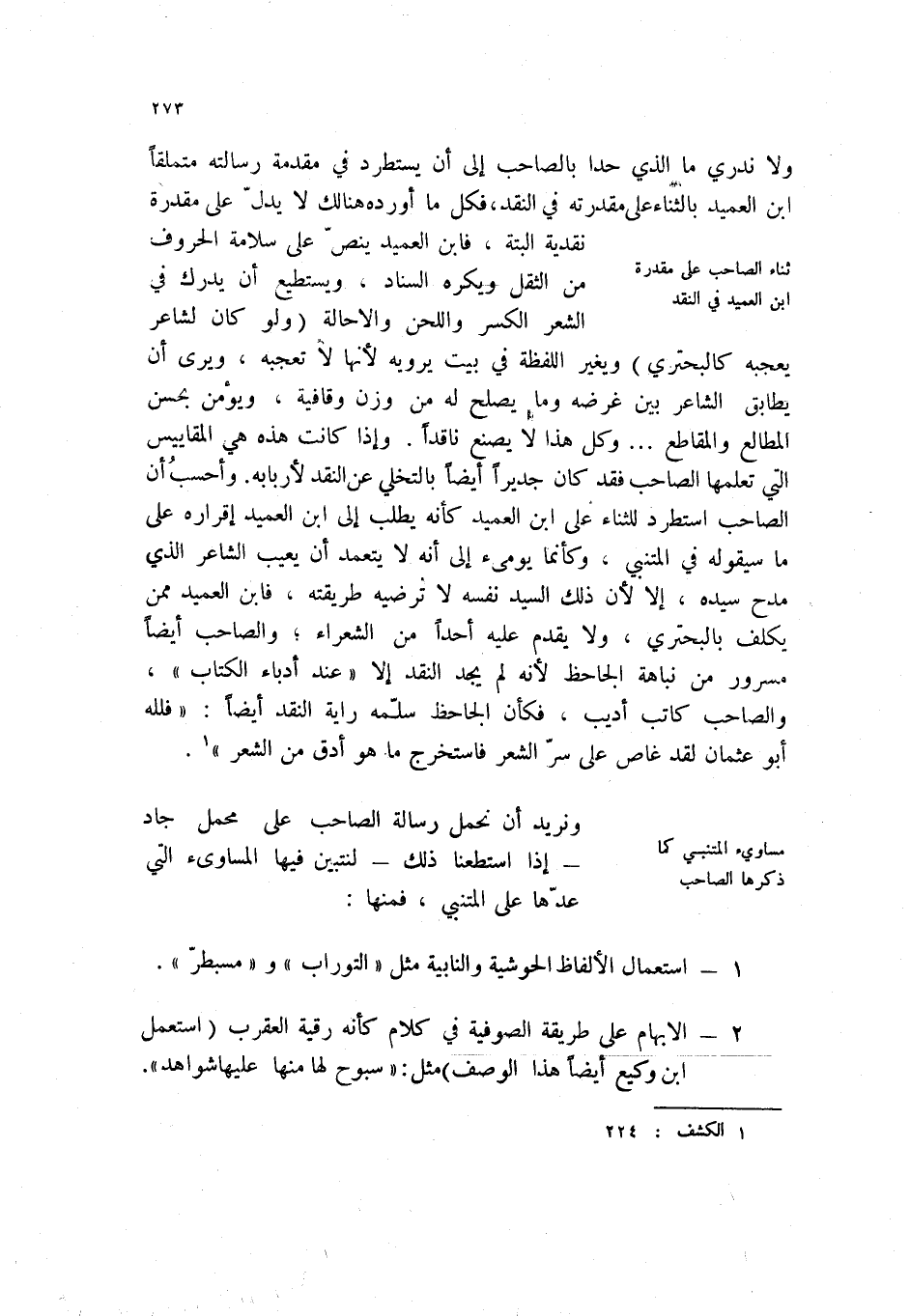 ولا ندري ما الذي حدا بالصاحب إلى أن يستطرد في مقدمة رسالته متملقاً ابن العميد بالثناء على مقدرته في النقد، فكل ما أورده هنالك لا يدل على مقدرة نقدية البتة، فابن العميد ينص على سلامة الحروف من الثقل ويكره السناد، ويستطيع أن يدرك في الشعر الكسر واللحن والإحالة (ولو كان لشاعر يعجبه كالبحتري) ويغير اللفظة في بيت يرويه لأنها لا تعجبه، ويرى أن يطابق الشاعر بين غرضه وما يصلح له من وزن وقافية، ويؤمن بحسن المطالع والمقاطع؟ وكل هذا لا يصنع ناقداً. وإذا كانت هذه هي المقاييس التي تعلمها الصاحب فقد كان جديراً أيضاً بالتخلي عن النقد لأربابه. وأحسب أن الصاحب أستطرد للثناء على أبن العميد كأنه يطلب إلى بن العميد إقراره على ما سيقوله في المتنبي، وكأنما يومئ إلى أنه لا يتعمد أن يعيب الشاعر الذي مدحه سيده، إلا لأن ذلك السيد نفسه لا ترضيه طريقته، فأبن العميد مم يكلف بالبحتري، ولا يقدم عليه أحداً من الشعراء؛ والصاحب أيضاً مسرور من نباهة الجاحظ لأنه لم يجد النقد إلا " عند أدباء الكتاب "، والصاحب كاتب أديب، فكأن الجاحظ سلمه راية النقد أيضاً: " فلله أبو عثمان فقد غاص على سر الشعر فاستخرج ما هو أدق من الشعر " (1) .