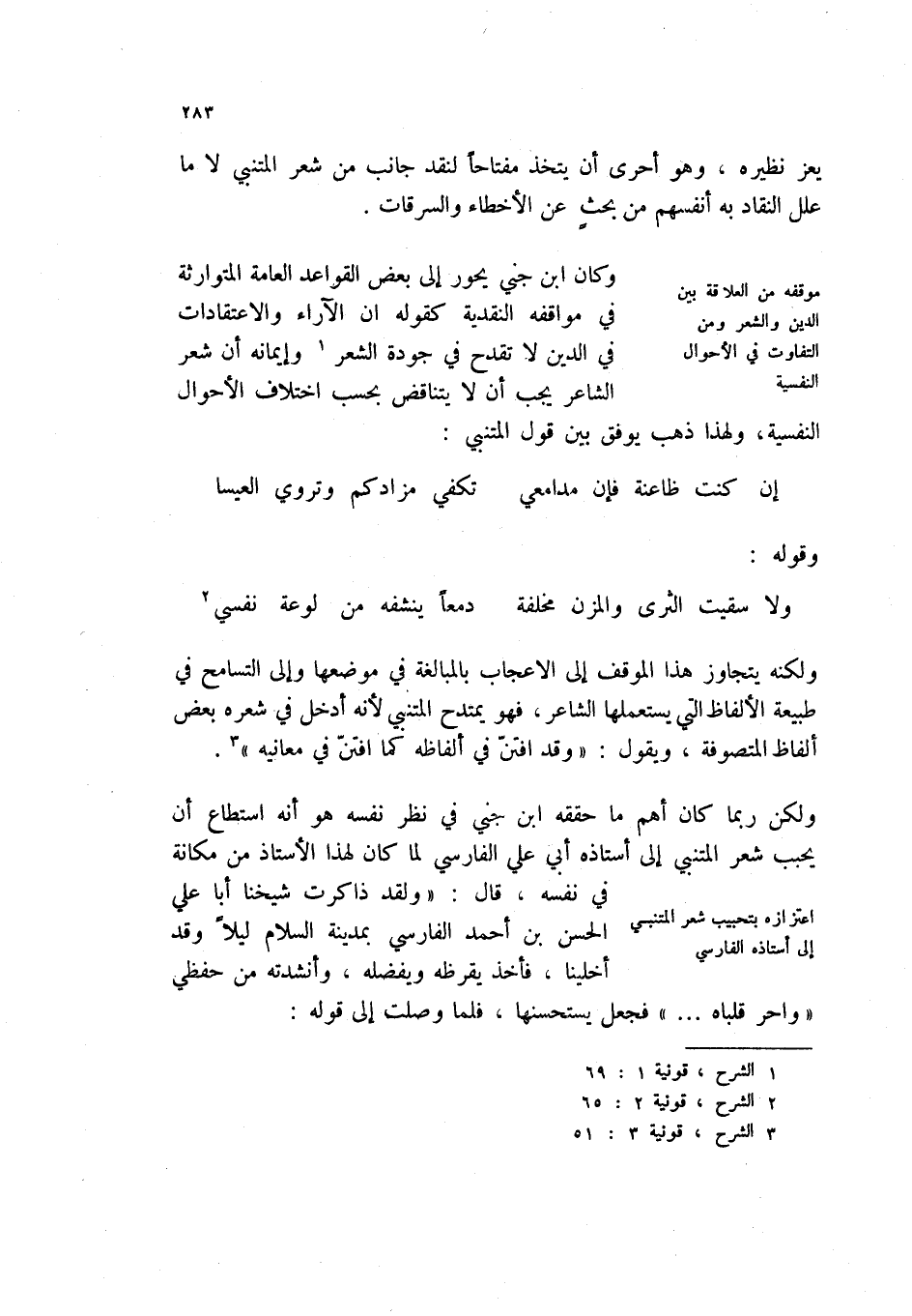 ولا سقيت الثرى والمزن مخلفه ... (2) دمعاً ينشفه من لوعة نفسي ولكنه يتجاوز هذا الموقف إلى الإعجاب بالمبالغة في موضعها وإلى التسامح في طبيعة الألفاظ التي يستعملها الشاعر، فهو يمتدح المتنبي لأنه أدخل في شعره بعض ألفاظه المتصوفة، ويقول: " وقد افتن في ألفاظه كما فاتن في معانيه " (3) .