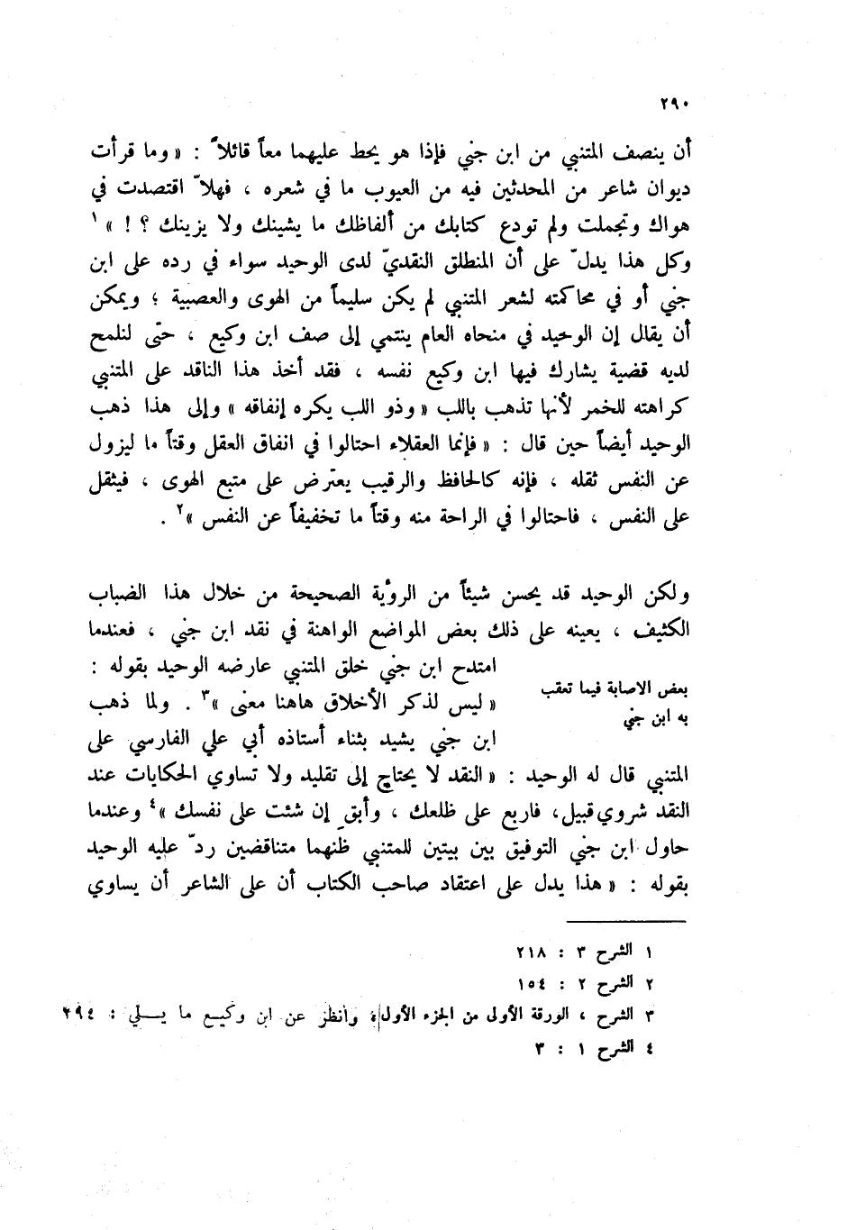 ولكن الوحيد قد يحسن شيئاً من الرؤية الصحيحة من خلال هذا الضباب الكثيف، يعينه على ذلك بعض المواضع الواهنة في نقد ابن جني، فعندما امتدح ابن جني خلق المتنبي عارضه الوحيد بقوله: " ليس لذكر الأخلاق ها هنا معنى " (3) ولما ذهب ابن جني يشيد بثناء أستاذه أبي علي الفارسي على المتنبي قال له الوحيد: " النقد لا يحتاج إلى تقليد ولا تساوي الحكايات عند النقد شروري قبيل، فأربع على ظلعك، وأبق إن شئت على نفسك " (4) وعندما حاول ابن جني التوفيق بين بيتين للمتنبي ظنهما متناقضين رد عليه الوحيد بقوله: " هذا يدل على اعتقاده صاحب الكتاب أن على الشاعر أن يساوي