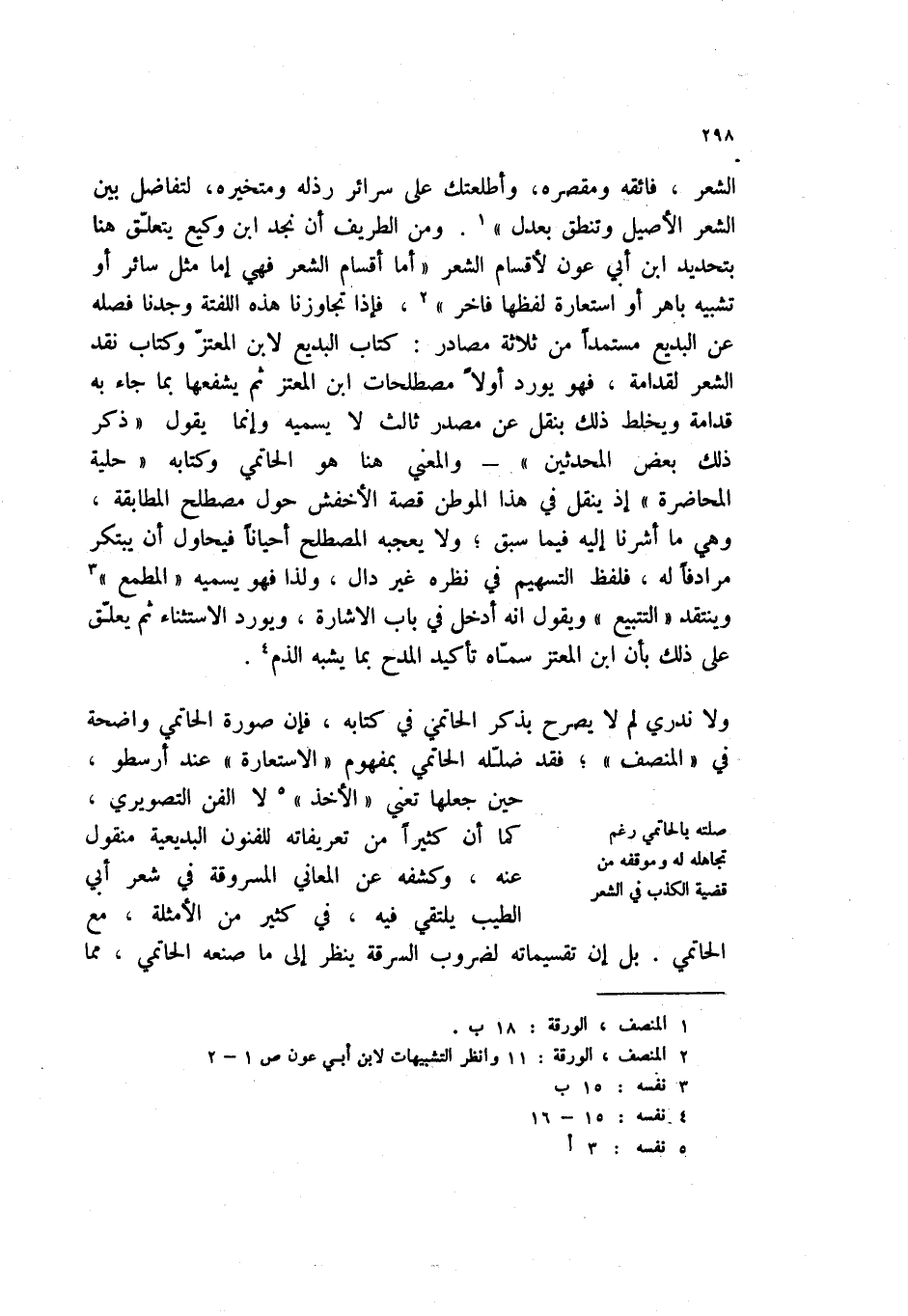 ولا ندري لم لا يصرح بذكر الحاتمي في كتابه، فإن صورة الحاتمي واضحة في " المنصف "؛ فقد ضلله الحاتمي بمفهوم " الاستعارة " عند ارسطو حين جعلها تعني " الأخذ " (5) لا الفن التصويري، كما أن كثيراً من تعريفاته للفنون البديعية منقول عنه، وكشفه عن المعاني المسروقة في شعر أبي الطيب يلتقي فيه، في كثير من الأمثلة، مع الحاتمي. بل أن تقسيماته لضروب السرقة ينظر إلى ما صنعه الحاتمي، مما
